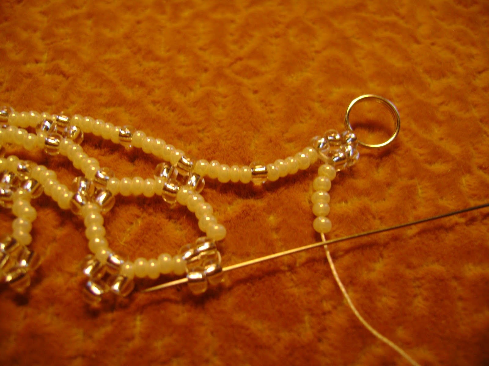 В это самое кольцо через еще одну бисеринку мы нанизываем и пришиваем колечко для замочка.