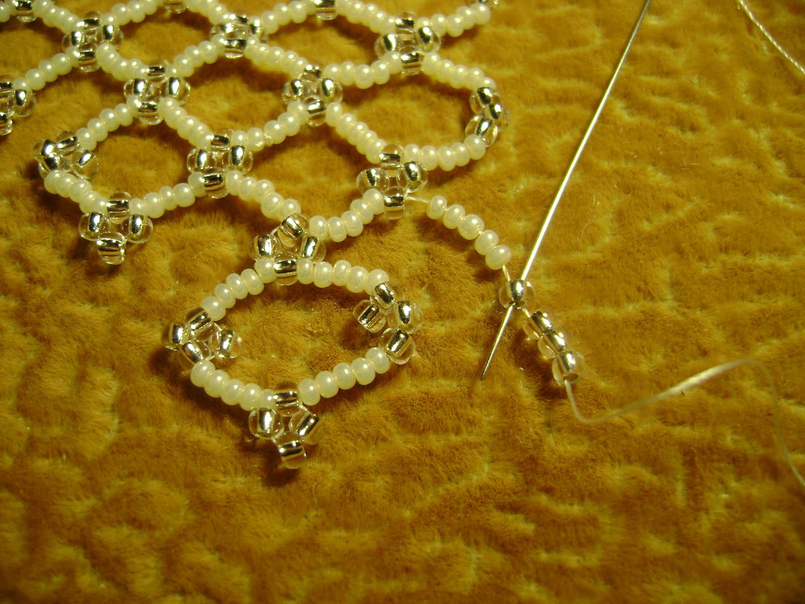 Заполняем промежуток между сотами 5-ю бежевыми бисеринами и входим иглой в две крайние прозрачные бисерины. И т.д. и т.п...