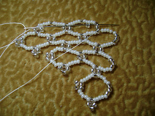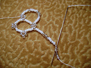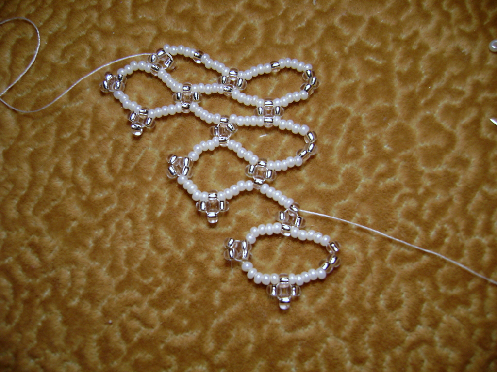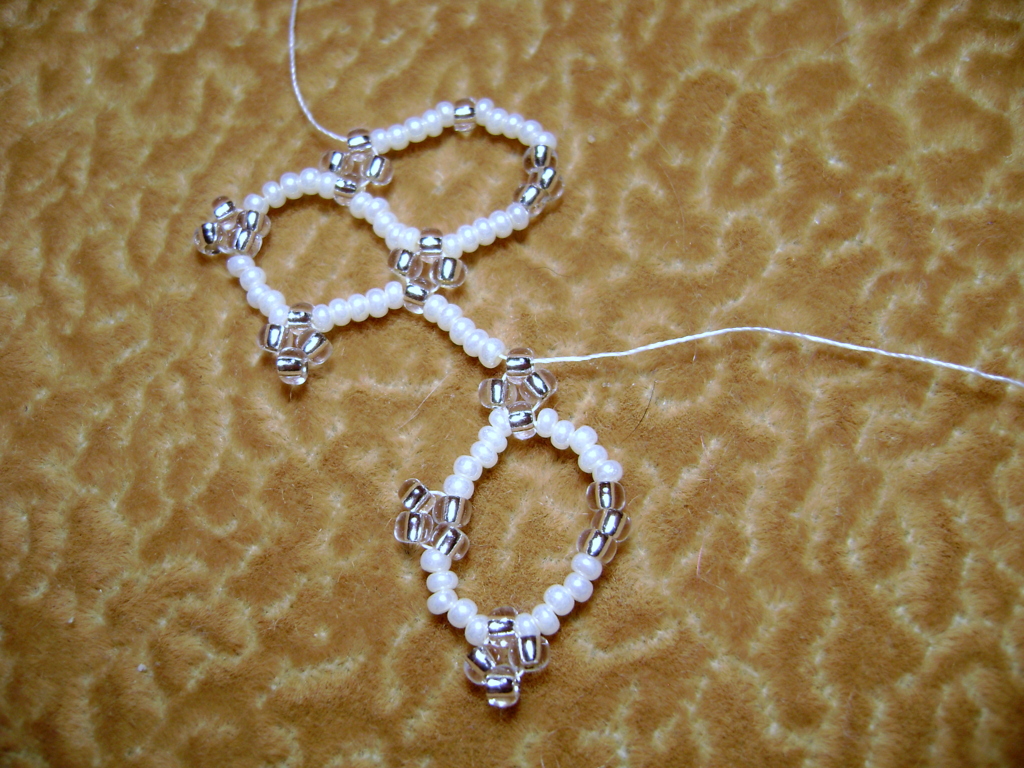 Нанизываем 1 прозрачную бисерину и проходим в верхнюю прозрачную бисерину из трёх сверху вниз. И так далее...