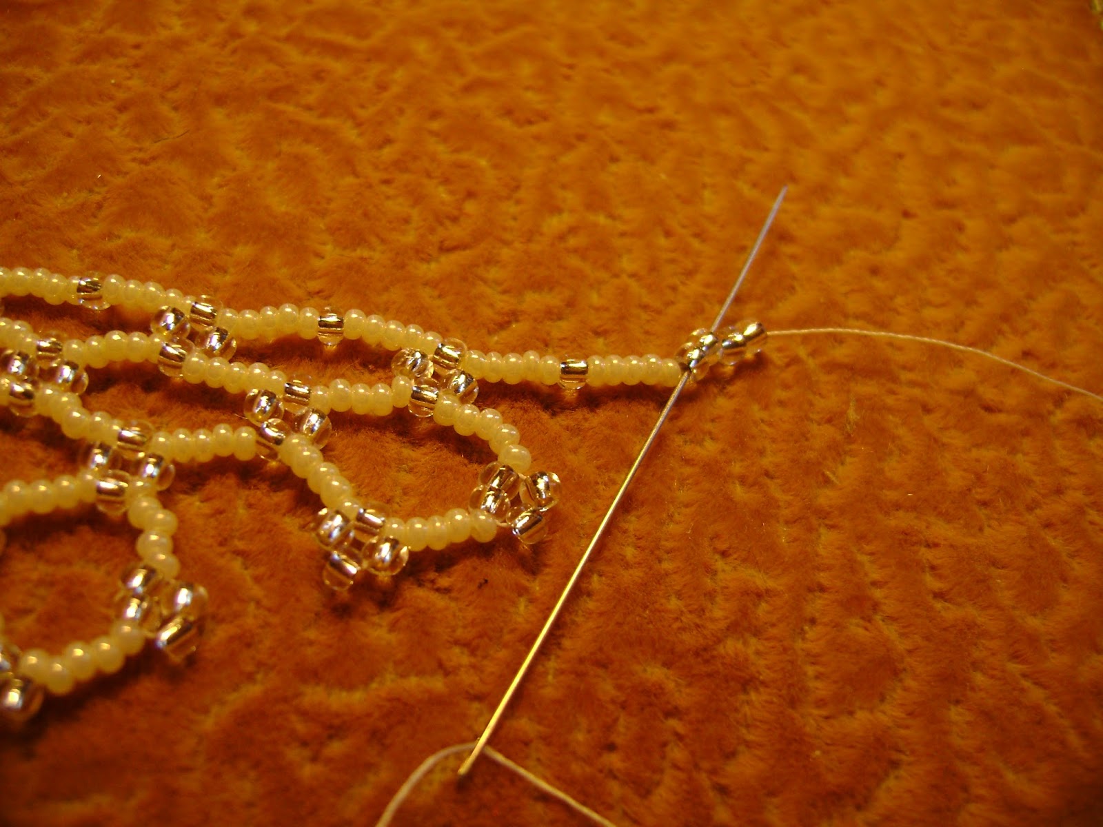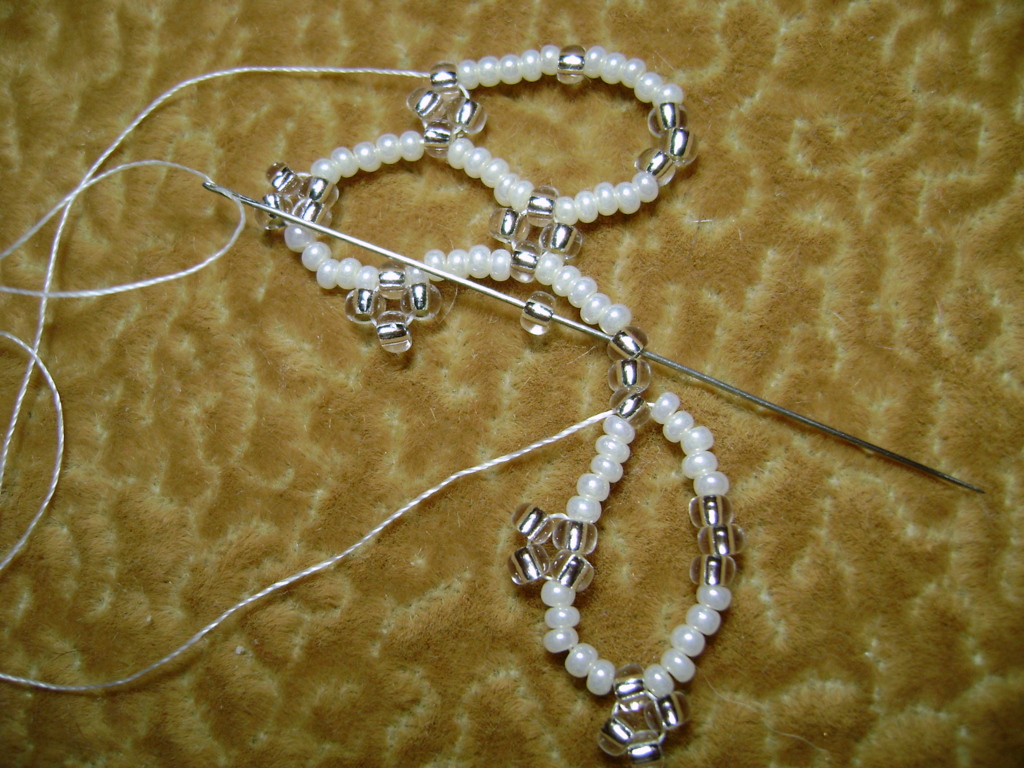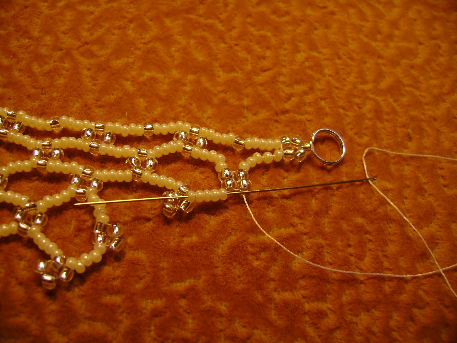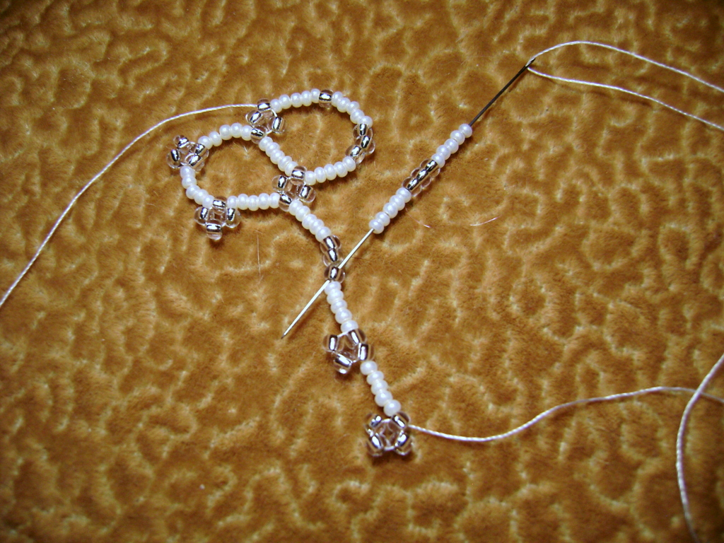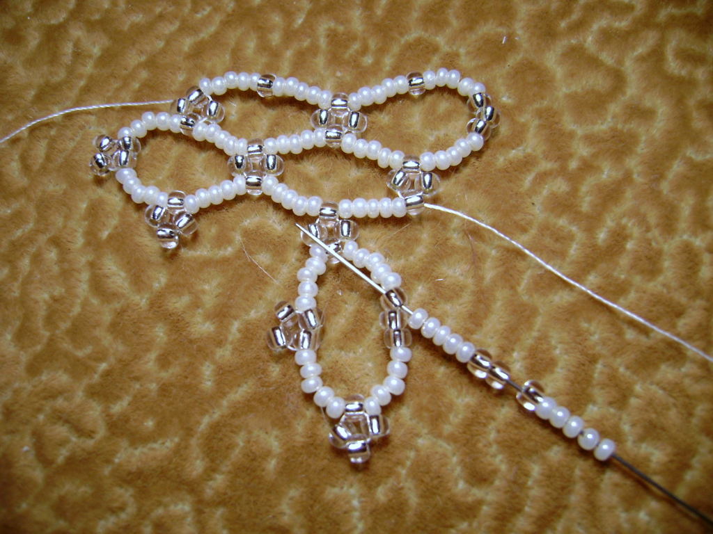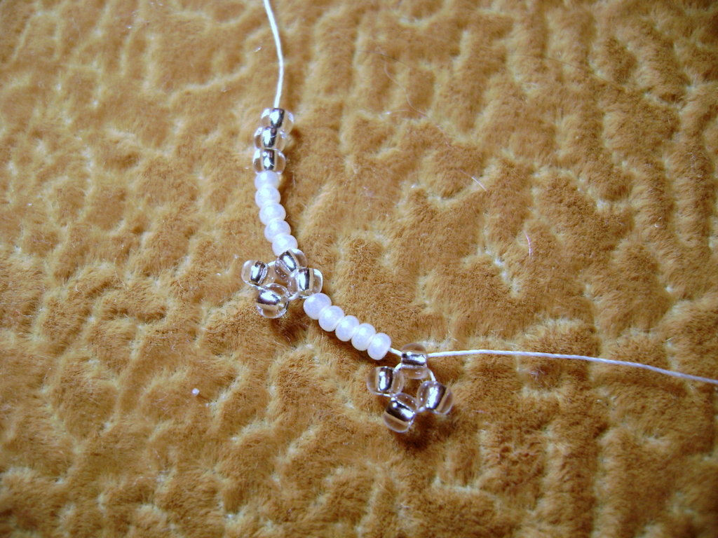 Нанизываем еще 5 бежевых, 3 прозрачных, 5 бежевых бисерин и входим иглой в нижнюю из трех прозрачных бисерин сверху вниз, как это показано на фото.