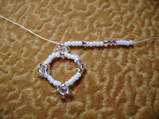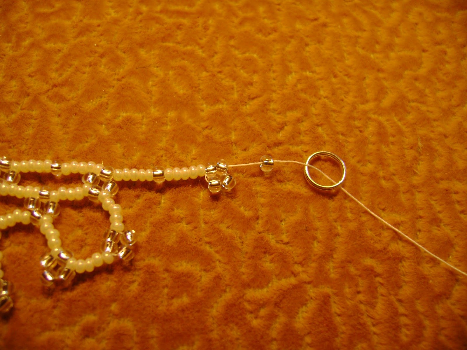 Нанизываем 5 бежевых, 1 прозрачную, 5 бежевых, 4 прозрачных бисерины и проходим иглой в две из 4-х прозрачных бисерин, замыкая кольцо.