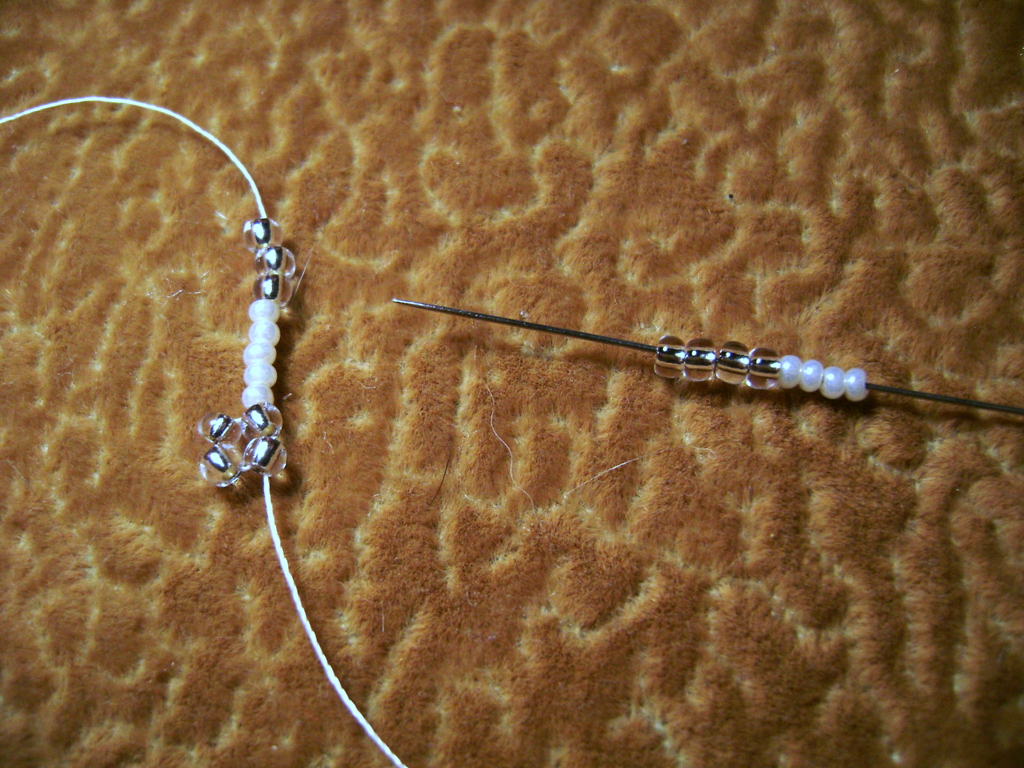 Набираем на иголку три прозрачных бисерины, 5 бежевых, четыре прозрачных.