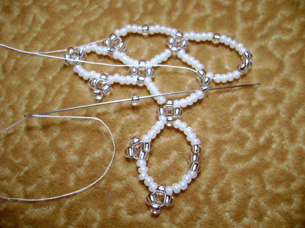 Нанизываем 5 бежевых, 3 прозрачных, 5 бежевых бисерин. Проходим иглой в нижнюю прозрачную бисерину из той троицы, что не замкнута в колечко или крестик. Иглой проходим сверху вниз.