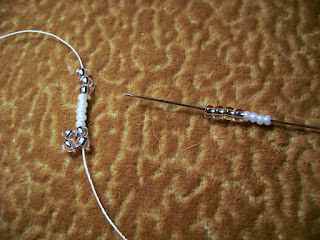 Нанизываем еще 5 бежевых и 4 прозрачных. Проходим иглой в одну прозрачную (верхнюю) сверху вниз, замыкая "крестик".