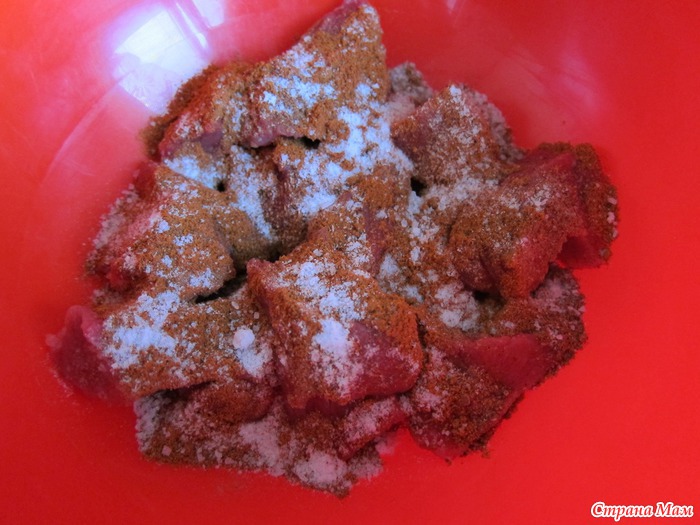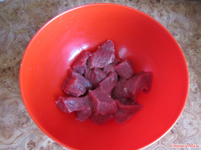 Мясо (300 г на порцию - любое: говядина, свинина, курица, индейка) нарезаем кусочками.