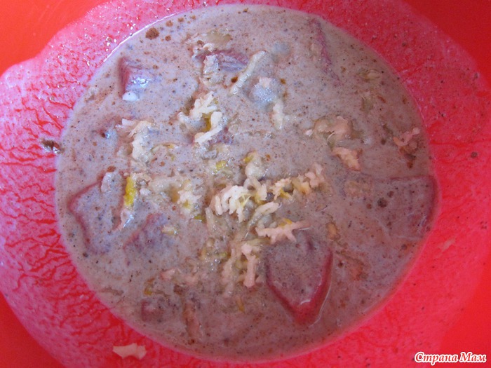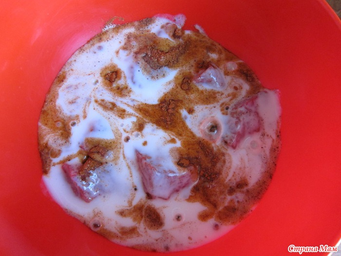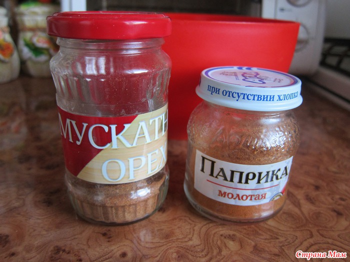 Заливаем соусом из 1 ч. л. мускатного ореха и 2 ч. л. паприки, плюс соевый соус (можно кефир или минеральную газированную воду - тогда еще и солим).