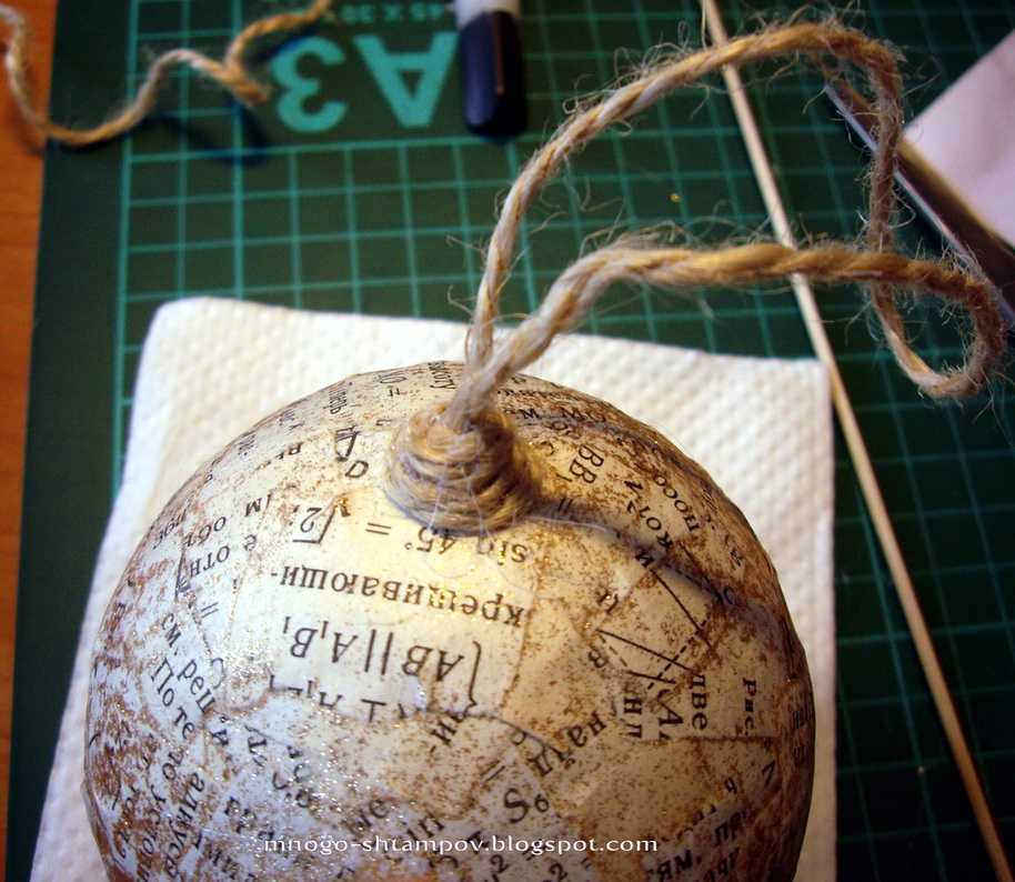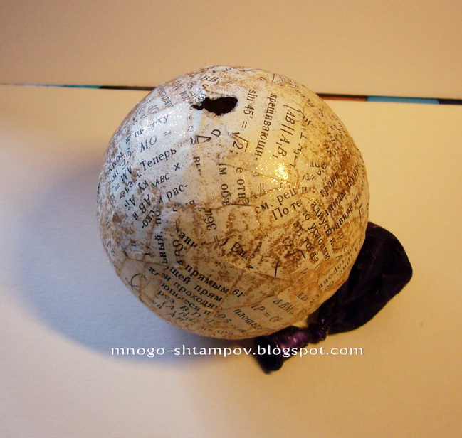 На мой взгляд, здесь были взяты обычные елочные шары и обклеены кусочками бумаги с текстом. Но мы легких путей не ищем, зачем портить шары - еще пригодятся, мы пойдем дальше.