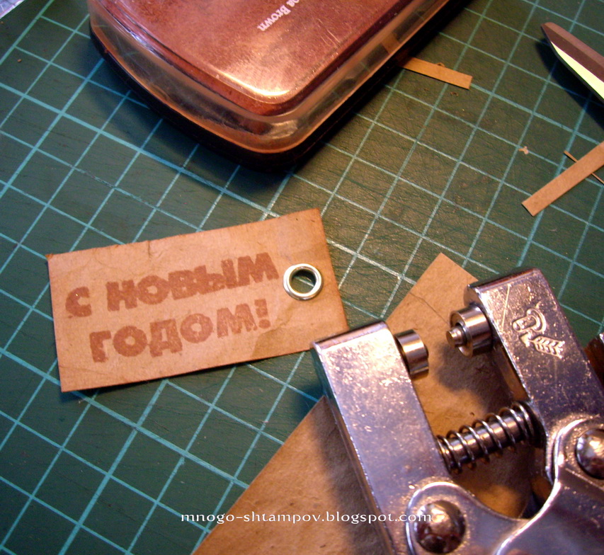 Ярлычок. Ставим оттиск штампиком на крафт-бумаге, вырезаем, тонируем края, ставим люверс. Ниточку я взяла потоньше (ирис), она была белая, поэтому я ее тоже потерла подушечкой коричневого цвета.