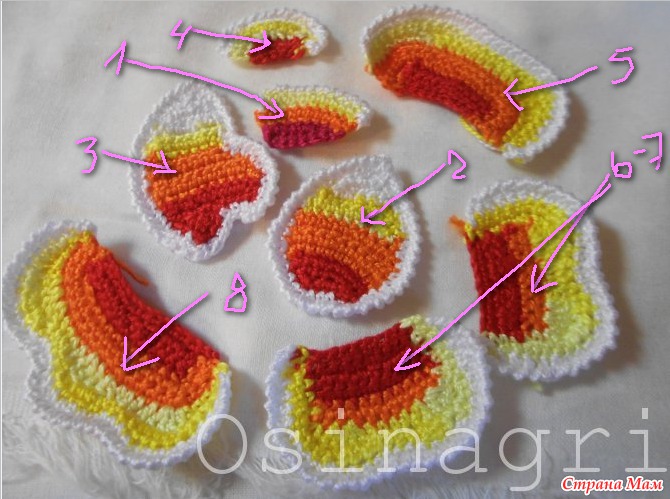 ВОСЬМОЙ листик:Красным:14 в/п., второй ряд-14 ст б/н. третий ряд точно так-же. Оранжевый:20 ст б/н, следующий ряд-21 ст б/н и последний=23 ст б/н
