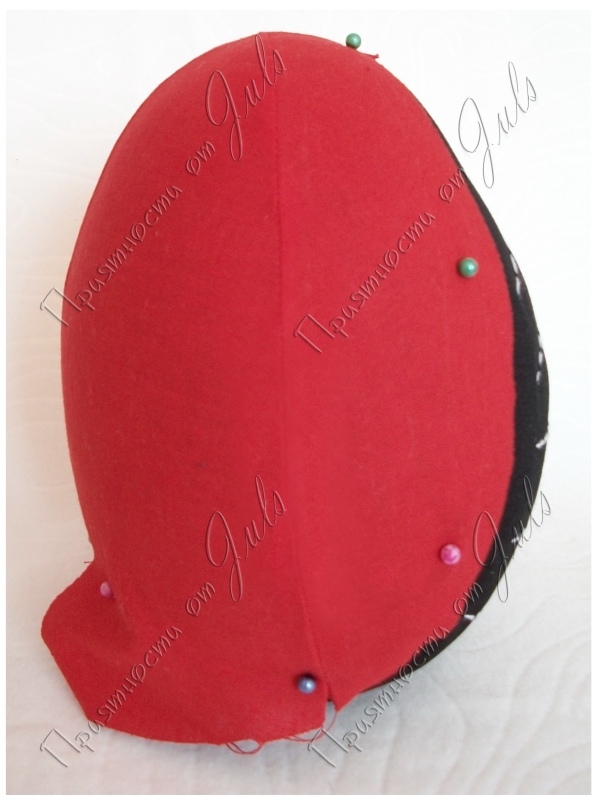 На спинке внизу, на крыльях делаем "защипы" в районе уголков и тоже фиксируем шпильками. Потом подгибаем края крыльев по всему периметру на 0,5-0,7 см и пришиваем черной мулине.