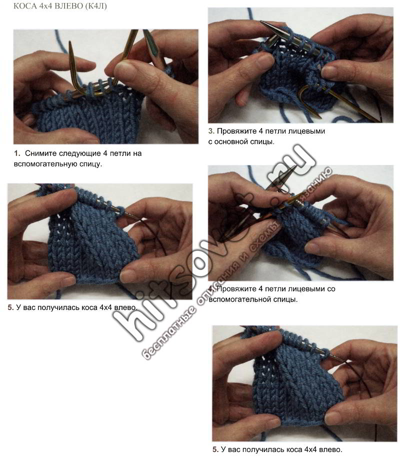 /cdn.shortpixel.ai/client/q_glossy,ret_img,w_130/https://hitsovet.ru/wp-content/uploads/2019/11/K4P-130x160.jpg" target="_blank">https://cdn.shortpixel.ai/client/q_glossy,ret_img,...ploads/2019/11/K4P-130x160.jpg 130w, https://cdn.shortpixel.ai/client/q_glossy,ret_img,...ploads/2019/11/K4P-350x433.jpg 350w" style="zoom: 1; border: 0px none; max-width: 100%; height: auto; padding: 0px;" width="266" />Коса 4 на 4 влево (К4Л): Снимите следующие 4 петли на вспомогательную спицу и расположите ее перед работой. Провяжите 4 петли с основной спицы лицевыми, затем провяжите 4 петли со вспомогательной спицы лицевыми.