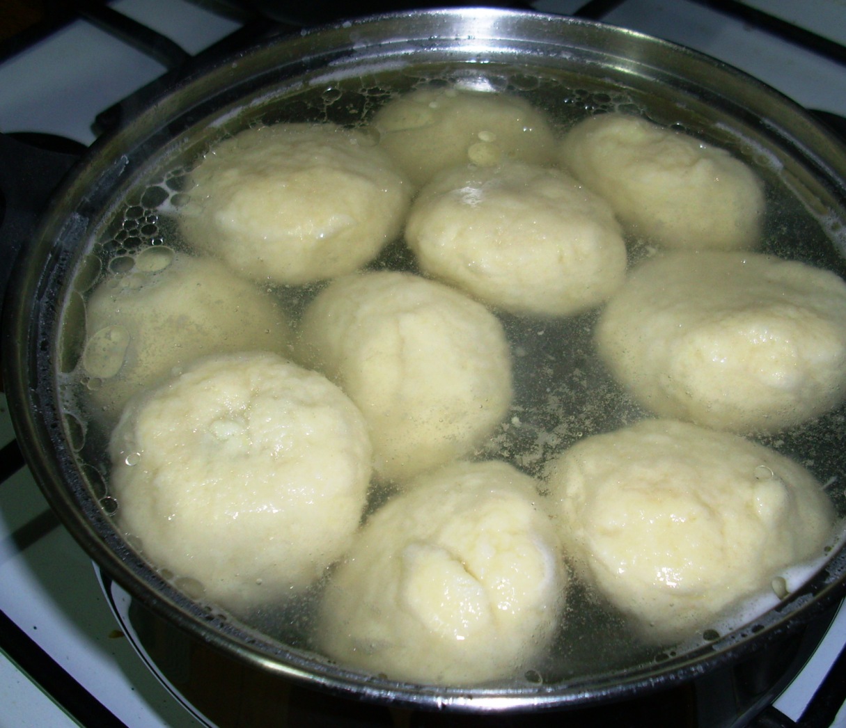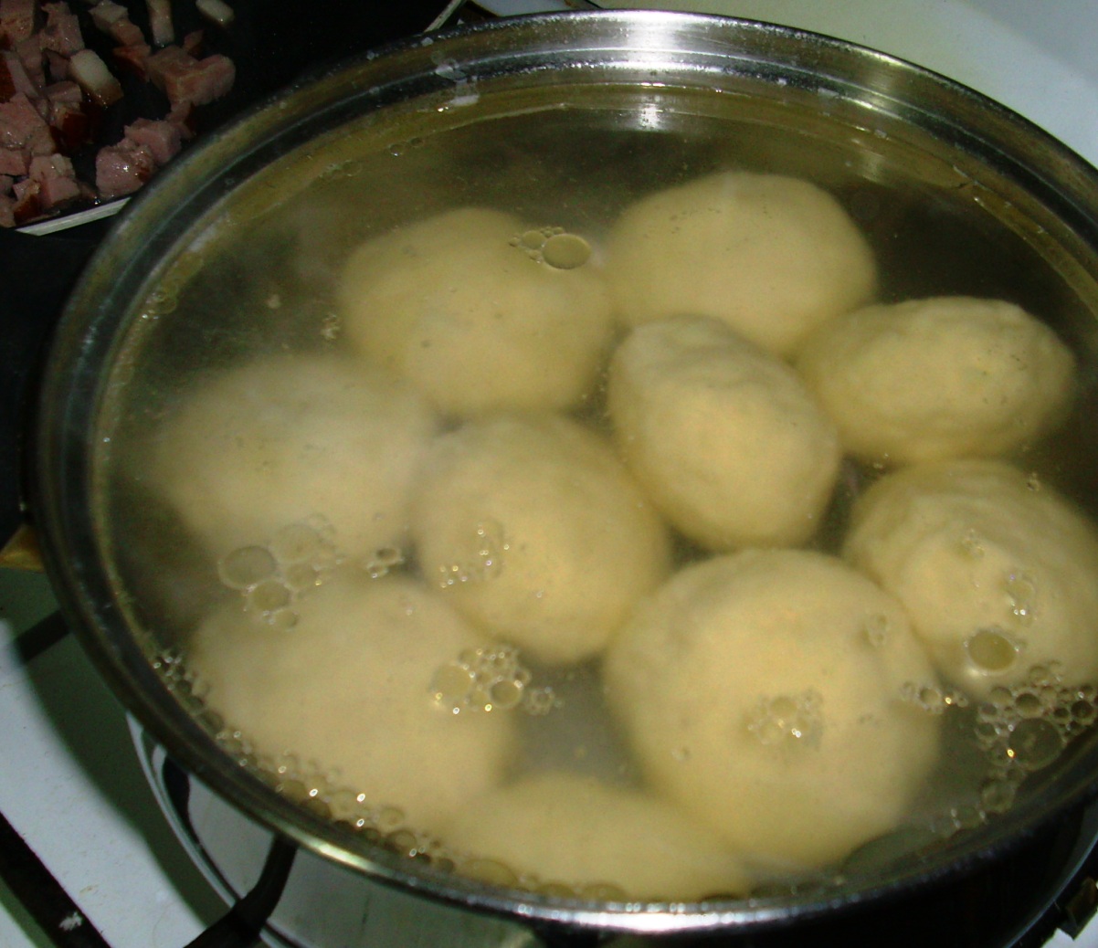 За кипятить воду с солью и небольшим количеством оливкового масла. В Кипящую воду положить кнедли После подъема кнедлей на верх,по кипятить их еще 5 минут на медленном огне.