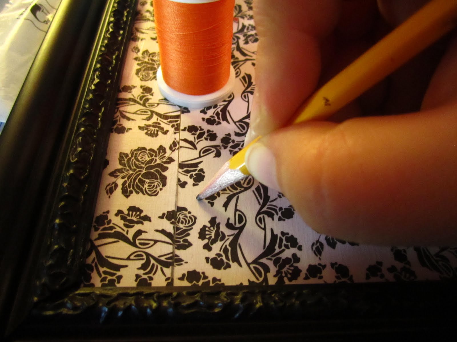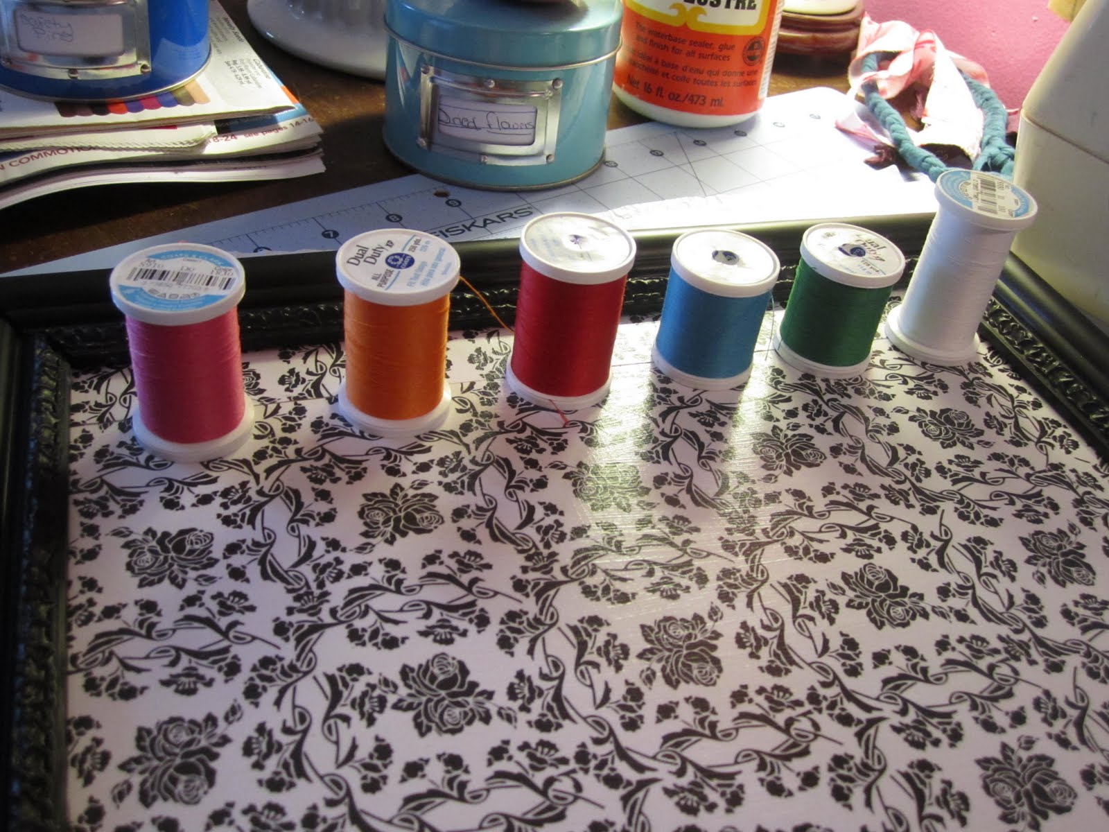 Here is how I made it, First things first decide what it is you want, your color scheme and such. Now find a picture frame, figure out how much thread you have/need and what size you like. Then if you don't have a back go to any home improvement store and search through there spare wood bins, I got a very large piece for .51 cents. and they cut it for me. Find scrapbooking paper that you like and doesn't distract from the look you want, Mod Podge, a brush, nails and hangers for the frame itself
