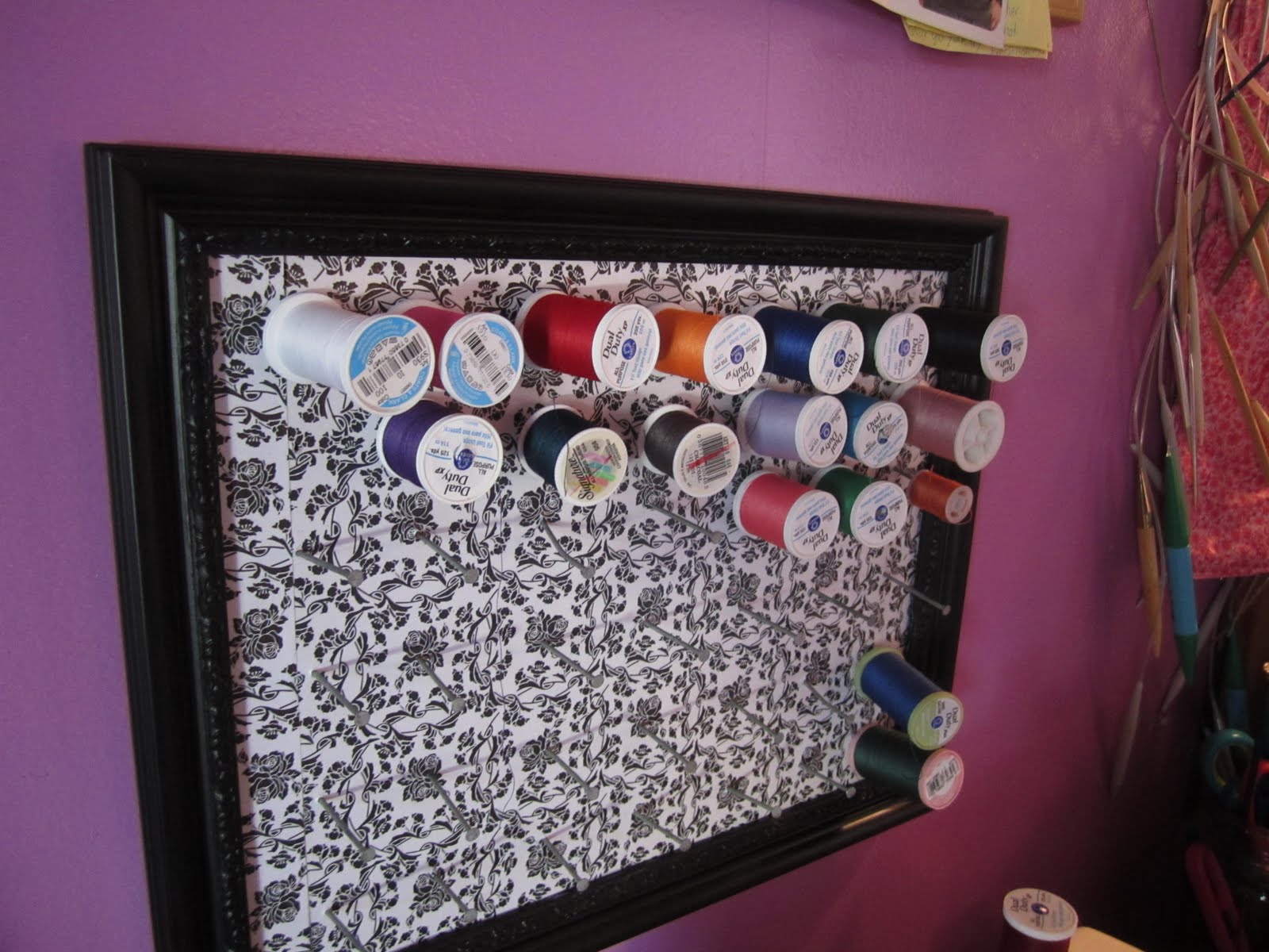 Be careful when hammering not to go through the wood piece, I did a few times but nothing to bad. Then hang on your wall, add your spools and admire your craftiness. Please send pictures, I love to see how people take an idea and make it there own, that is how this came about.