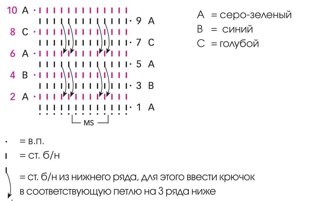 Серо-зеленой нитью выполнить цепочку из 73 (83) 93 в.п. + 1 в.п. подъема и для планки связать 2 см ст. б/н. Продолжить работу узором из полос.