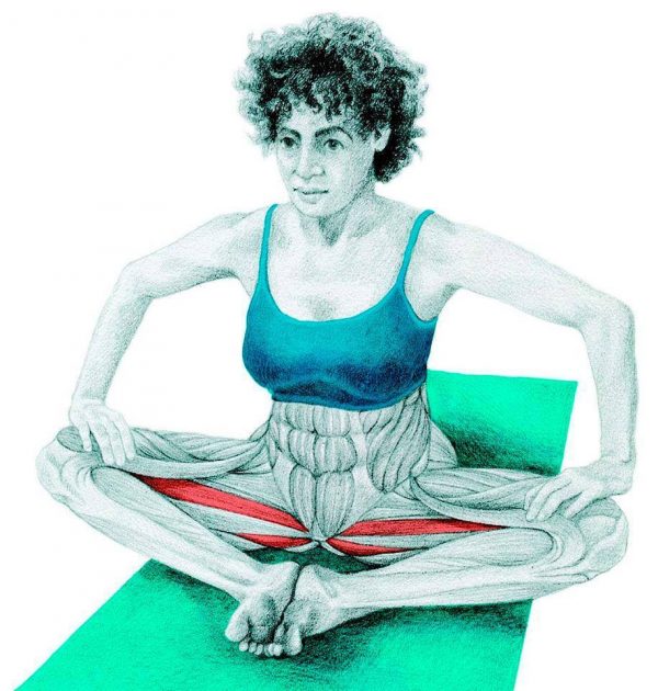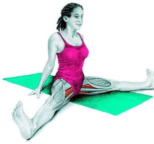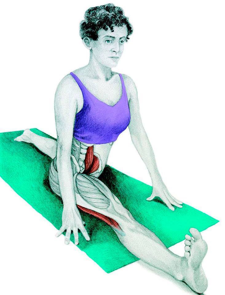 Растягиваются аддукторы (приводящие мышцы). Эта растяжка раскрывает бёдра, расслабляет подколенные сухожилия и приводящую мышцу.