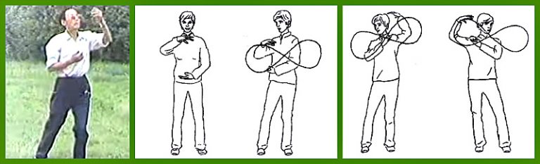 Выполнение. Упражнение при выполнении очень легкое, а вот описать его сложно. Чтобы понять, как выполняется это упражнение, нужно представить, что вам надо руками нарисовать 3 круга, расположенных друг над другом — «тройная восьмерка».