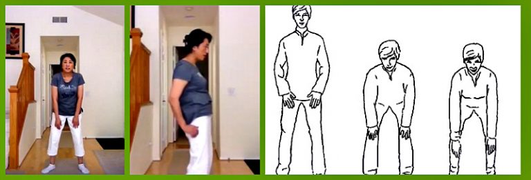 Выполнение: Немного согните колени и слегка присядьте, оперевшись ладонями о ноги. Медленно передвиньте ладони на колени и приподнимите бедра, одновременно приподнимите пятки. Руки опустите с коленей вниз, они должны свободно свисать, плечи и голову тоже наклоните вниз. Начните медленно поднимать тело, выпрямляя его. И завершите выпрямление тела отведением плечевых суставов назад, опускаясь с подушечек пальцев на всю ступню. При этом последнем движении громко выдохните. Упражнение повторяется 8 раз.