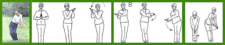 Внимание должно быть сосредоточено на вращении плечевых суставов и талии, взгляд направлен перед собой.