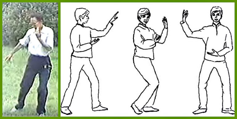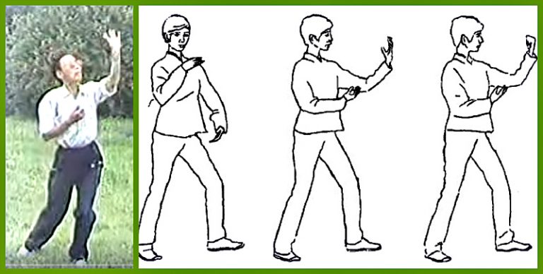Теперь вес тела полностью переместите на левую ногу, чтобы дать возможность правой ноге совершить полукруг и отступить на полшага в правую сторону. Во время перемещения веса тела, пятку левой ноги поверните, не отрывая ее от пола, правую ногу поверните на подушечках пальцев. Руки плавно перемещаются вправо. Теперь свое внимание сосредоточьте на правой руке и повторите все, что было описано выше. Повторяйте движения в одну и другую сторону — по 8 раз.