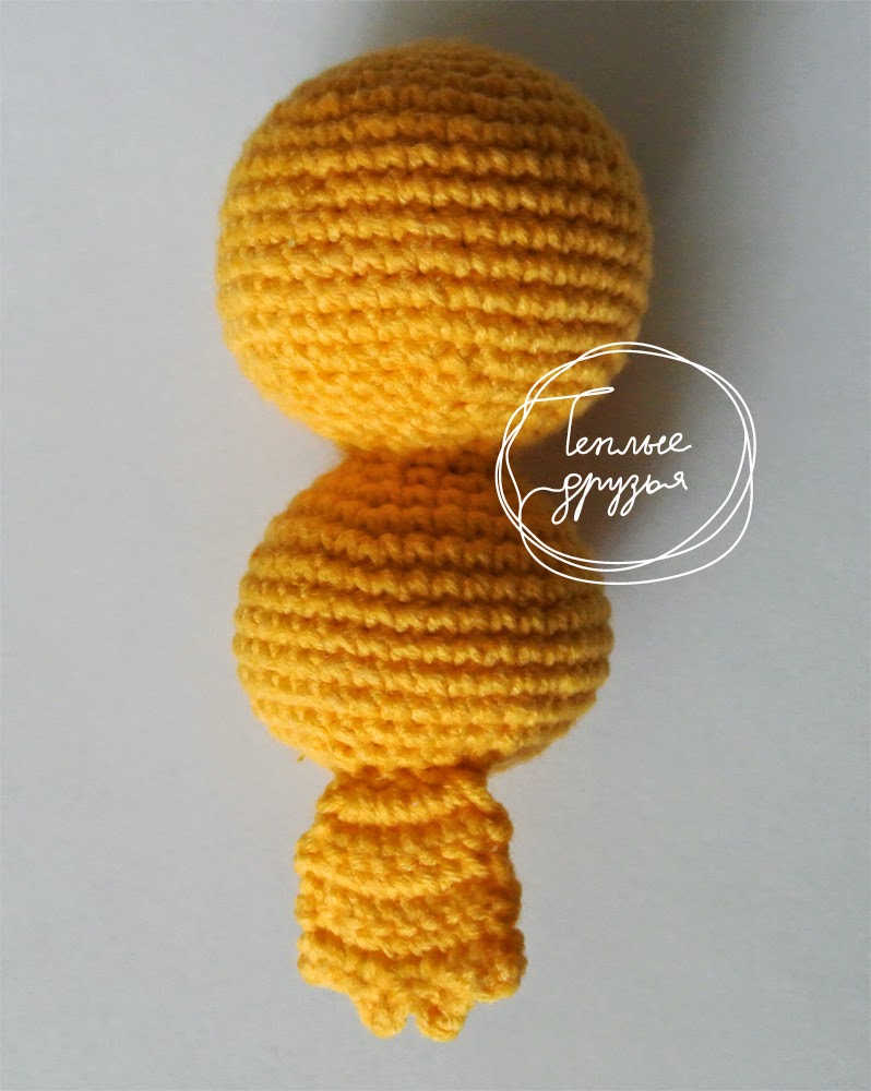 У девочки: набрать по тушке (большой шарик - голова, маленький - тушка) 5 сбн., повернуть вязание, со второй от крючка сделать 4 прибавки, далее провязать по 8 сбн. нужное кол-во рядов (на ваше усмотрение, у меня 4 ряда). Последний ряд провязать пико.