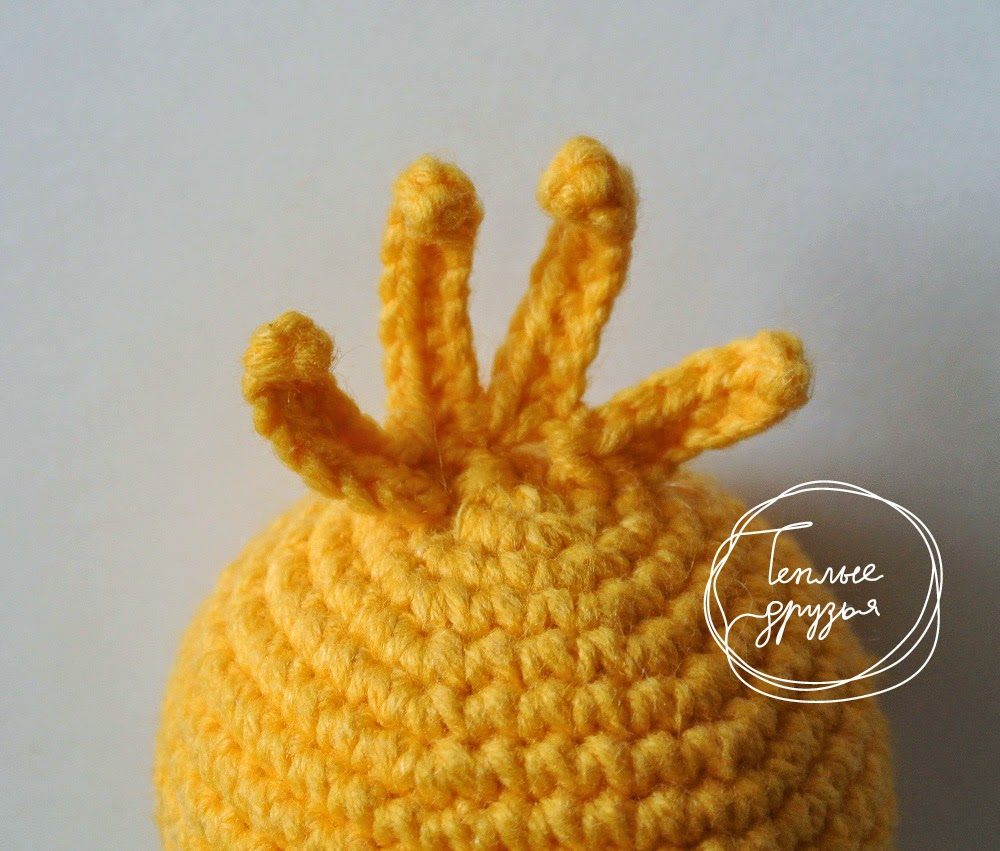 У девочки: хохолок состоит из 4 перышек. Присоединить нить к макушке, набрать 8 в.п., начиная со второй от крючка провязать 7 сбн., далее провязать сс. в голову. Из этой же петли набрать 10 в.п., со второй от крючка провязать 9 сбн. Еще раз набрать 10 в.п., и последнее перо - 8 в.п.