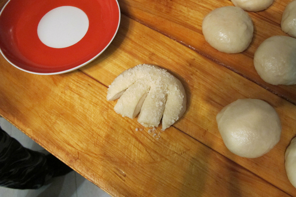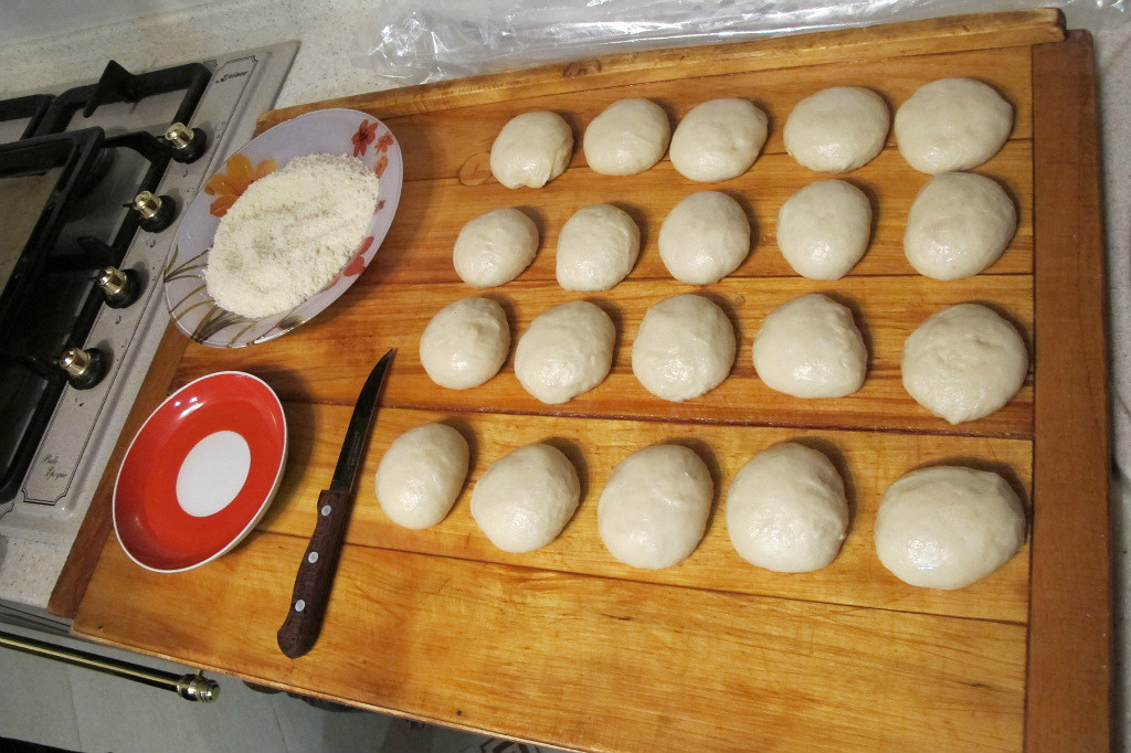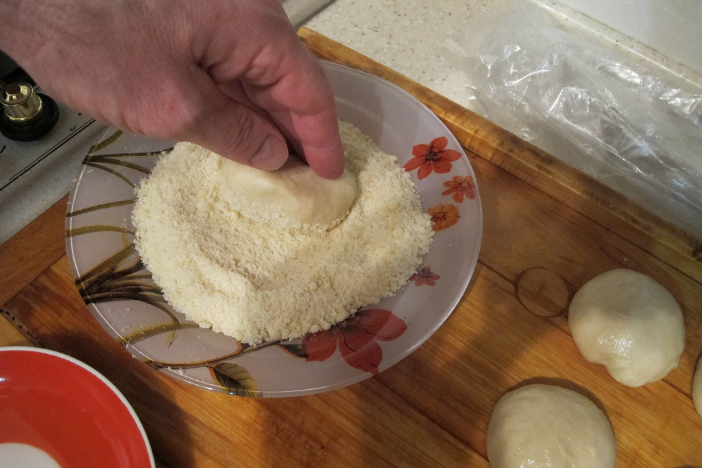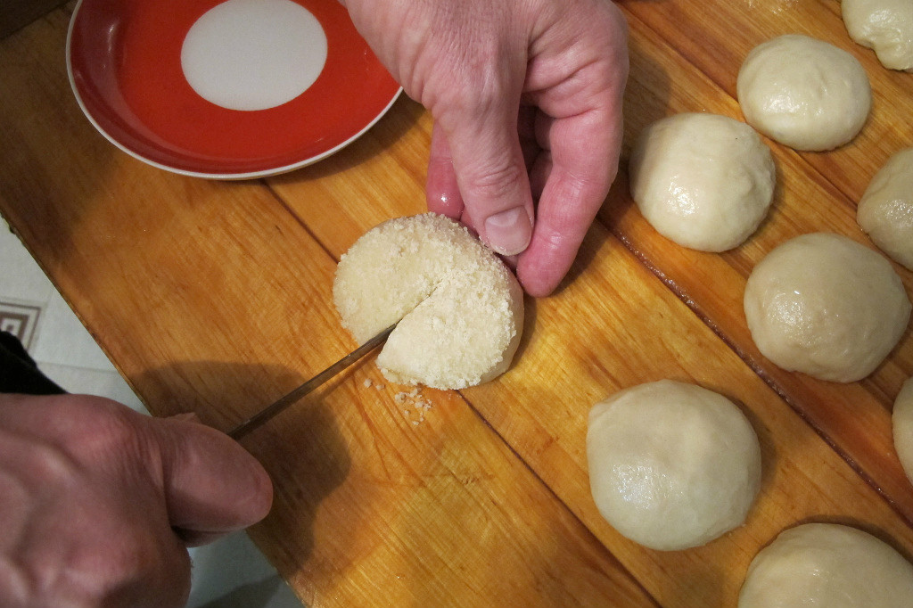 Замешиваете обычное дрожжевое тесто. После первого подъема - обминка. После второго подъема - разделка.