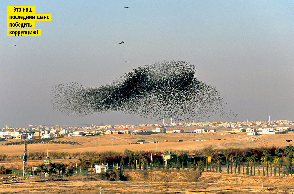 В ЕЭС существует целое научное сообщество, изучающее поведение скворцов с целью совершенствования методов влияния на массовую аудиторию. Раньше нас как-то больше ассоциировали со свиньями: у нас даже некоторые органы весьма схожи. А вот в виде толпы мы почему-то больше напоминаем стаю скворцов. Если, конечно, верить ученым — вместо того, чтобы сразу пустить в ход кулаки. Тем не менее на этих снимках, сделанных в Израиле, показана хитрая тактика скворцов, с помощью которой они сбивают с толку соколов и одновременно создают сильный ветряной поток, который может выбить хищника из равновесия или вообще опрокинуть его. Во время атаки стая расширяется, сужается и постоянно меняет форму и плотность. Так как же скворцы взаимодействуют?