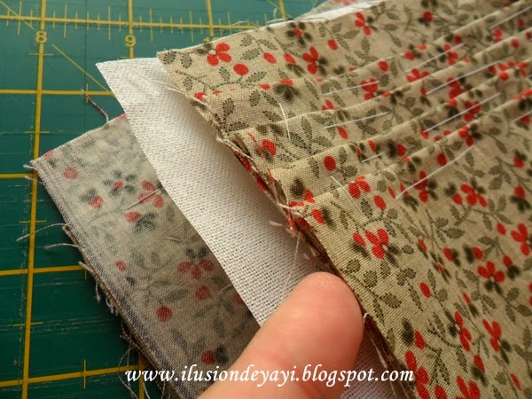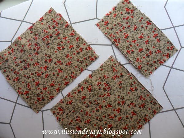 2-я часть урока: Вырезать три полосы. Два из 17 CMS. длина х 6.5 в ширину (половина см. швейная) и еще один завод 17 см.длинные х 10 см. Широкий (половина см. шитье с каждой стороны). Мы связываем швы с Puntillita как это выглядит на картинке: