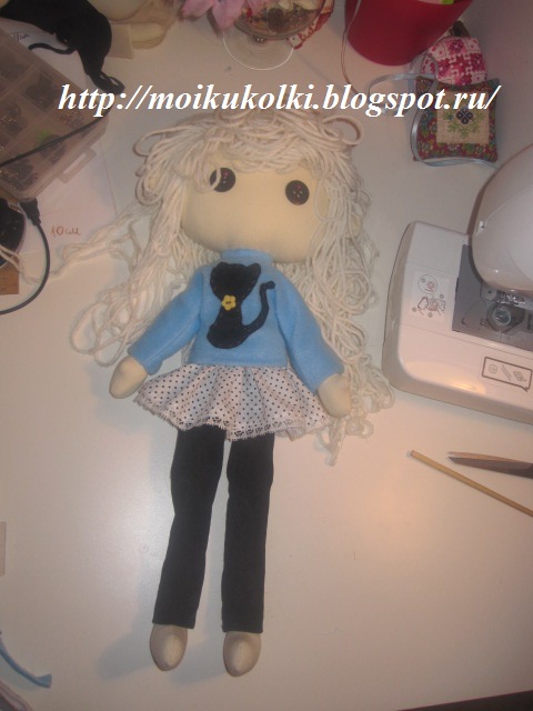 одеваю свмтер на куклу и скалываю где мы не строчили,зашиваю потайным швом . |