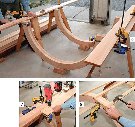 После того как вы обрежете каждую заготовку электролобзиком по изогнутым линиям [арка своими руками фото 4], соберите слой сегментов и закрепите винтами по шаблону, склеив затем первый слой со вторым зеркально. Затем заверните винты [арки фото 5] и снимите шаблон. Хотя кедр достаточно мягкий материал, но желательно под винты заранее просверлить отверстия меньшего диаметра. Это позволяет сделать винты части плотно вместе. Когда клей высохнет, жесткость всей конструкции значительно повысится, и вы можете гладко обработать края заготовки арки.