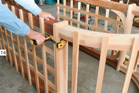 Изготовьте по шаблону, как мы делали ранее изогнутые колена для крепления углов. Разрежьте каждое колено на две части и закрепите их к арке и боковым панелям [арки фото 13].