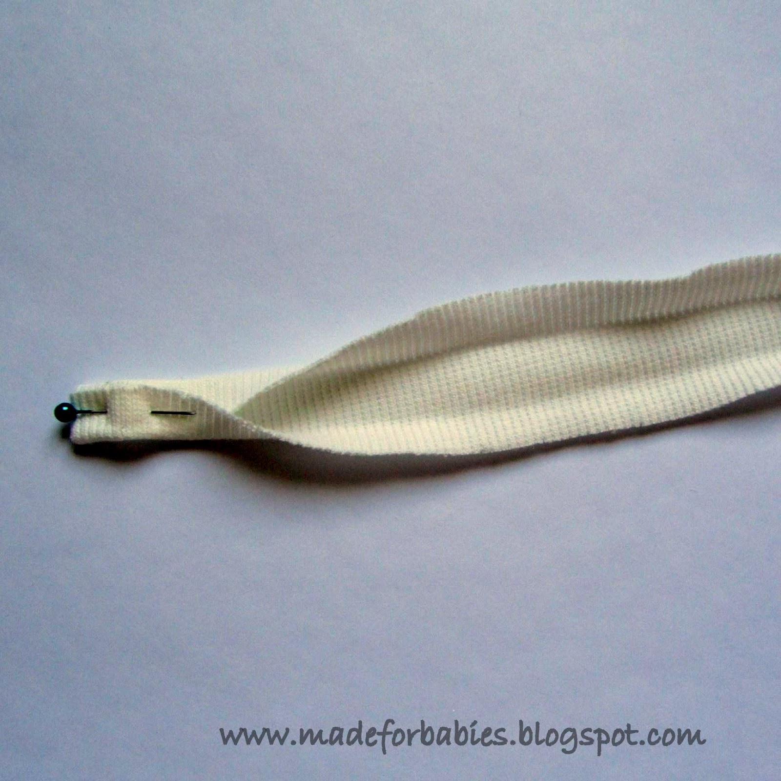 Готовим бейку для обработки горловины. Для этого загибаем ткань наизнанку на 5мм и заметываем. Это делается для того, чтобы край не скручивался ( что характерно для кулиров, особенно стрейчевых) и чтобы было удобно пришивать.