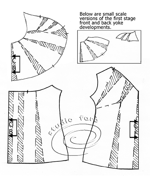 The unusual yoke shape was achieved by first expanding the front and back yoke separately as below. Then joining them together as one piece as you can see in the final pattern diagram. If you enjoy this kind of pattern making then join us at one of the