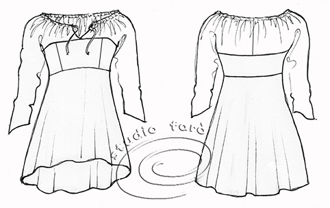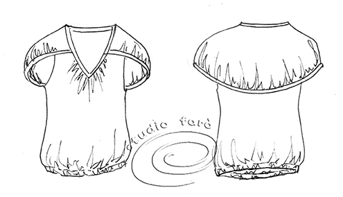 See below the production sketch shows gathering all round the yoke shape, creating a slightly puffed, cap sleeve. There is also gather in the 'V' neck feature and a loose cut caught by elastic in the hip area to create blouse near the hem.
