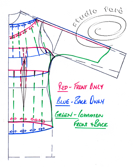 Below is the pattern plan worked out on a dartless kimono block. As always I have developed the plan with front and back on top of each other (old habit with this block). Hoping this time the colour coding is a little easier to read and not so confusing. Please email if you would like me to produce a separate front and back pattern plan.
