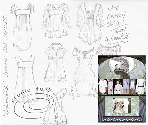 Here is the production sketch that includes all front and back detail, ready for patten making. In keeping with the original theme I would make this all in white, but create some interest by using three different fabric textures. From the top down I would use a chiffon/georgette for the sleeves and yoke, stretch woven for the bodice and a soft sheen woven, probably bias cut (not too transparent). You could choose to all silks or all polyesters depending on your price tolerance and laundering preferences.