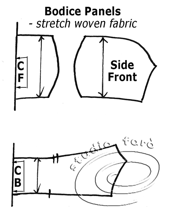While developing the pattern plan I decided that the bodice panels would be great in a stretch woven making the firmer fit more comfortable. Also may eliminate the need for a zip opening.