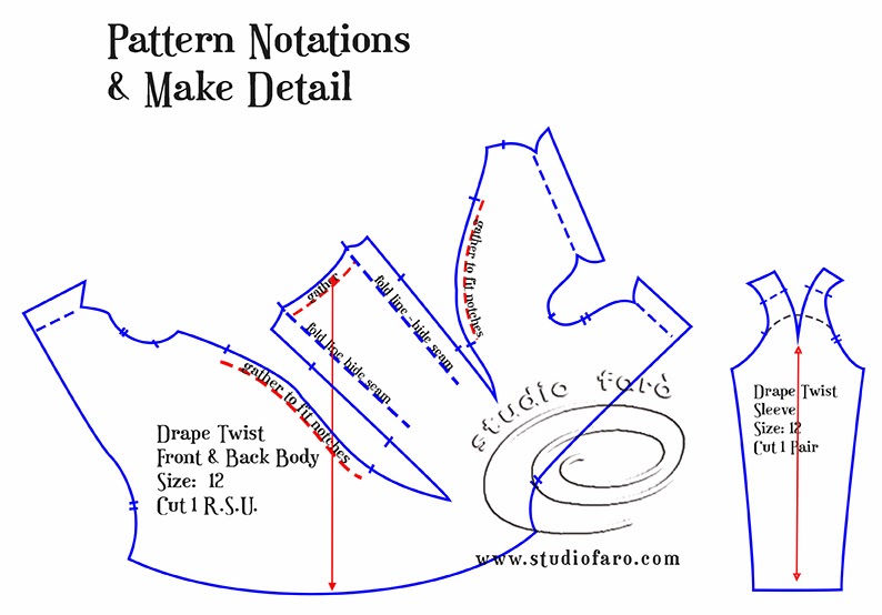 План шаблон основан на Плотно прилегающая вязать блока, подходящего для двухсторонней эластичной ткани. Пелерина и функция Twist на передней стиле имеют доминирующую часть драпировка по диагонали через фронт с собрались драпировка выходит из-под простыни и идет в противоположном направлении. Трудная вещь, чтобы увидеть этот план картины в том, что я намерен положить швом вниз середине задней части главного драпировка по диагонали, чтобы скрыть швы, которые держат собрать. Декольте и рукав реглан бы загнуть облицовки, которые образуют квадрат, на лодке декольте. По обеим сторонам задней драпировка продолжают в течение бокового шва в задней части.