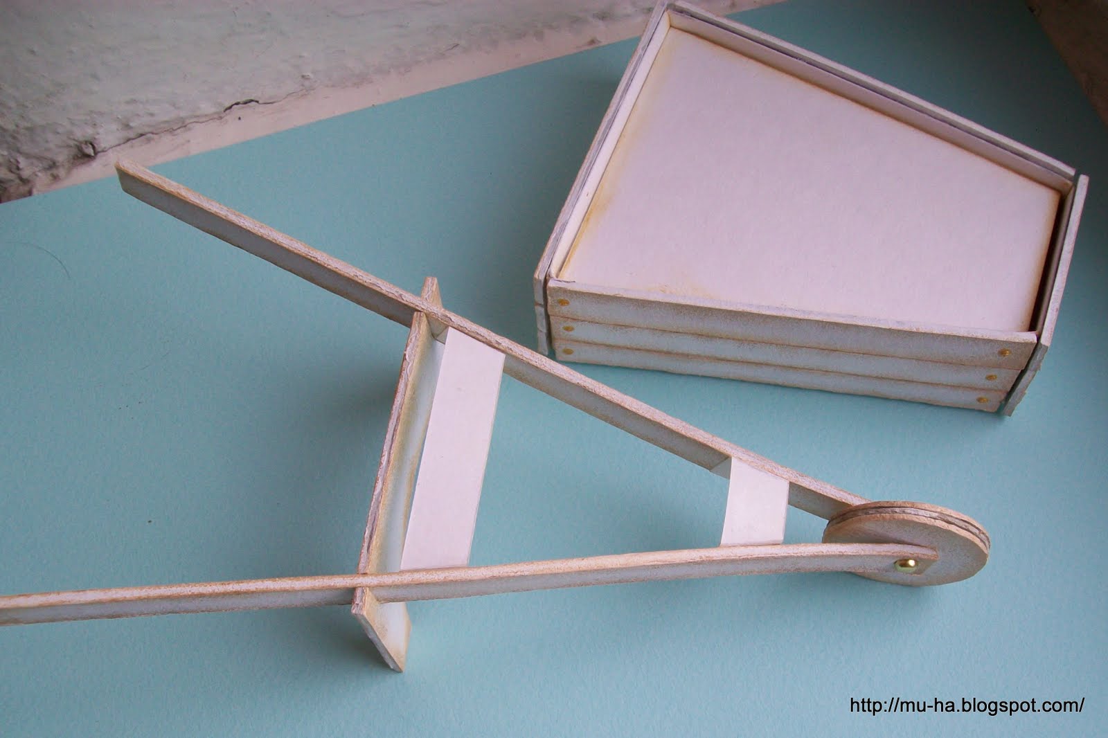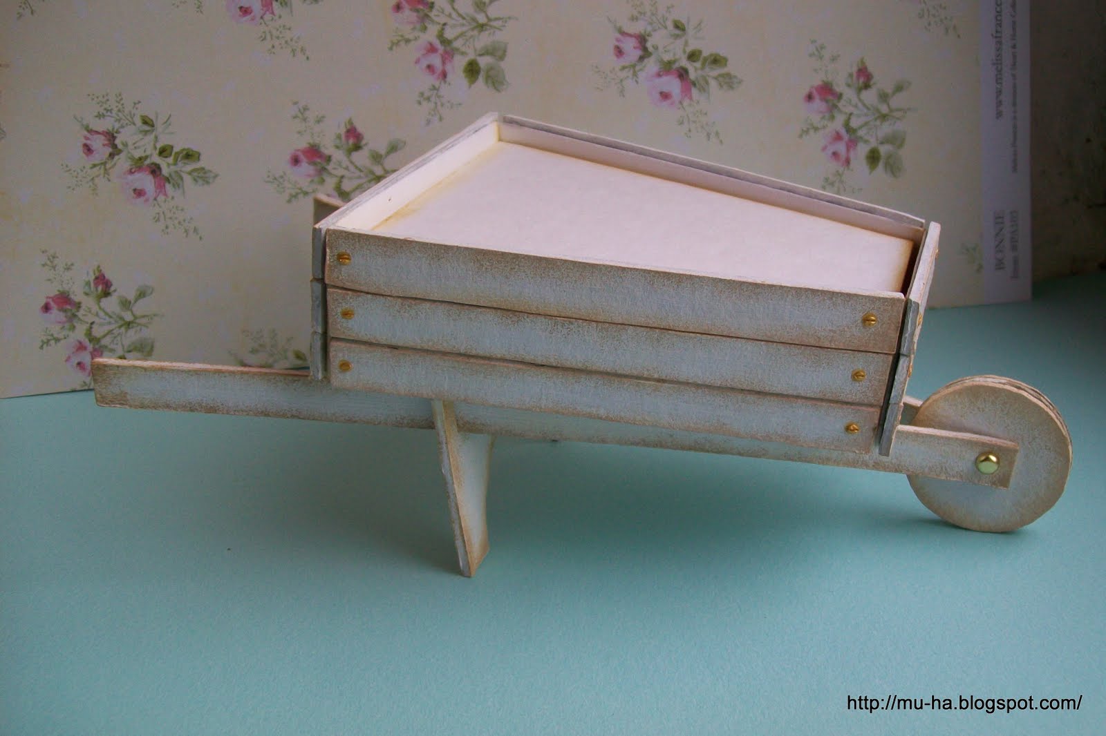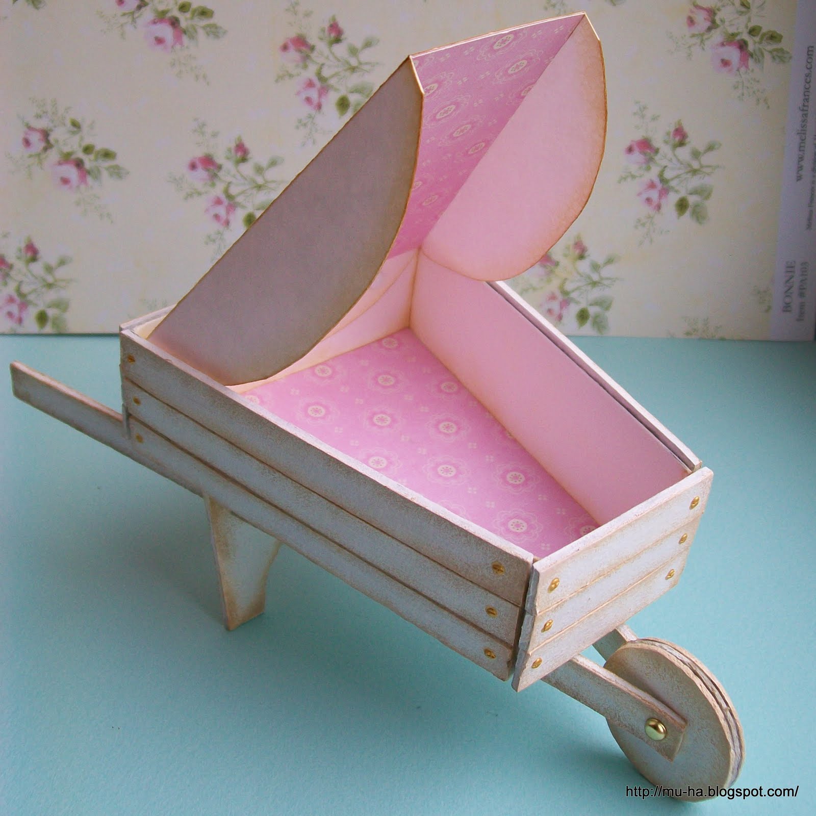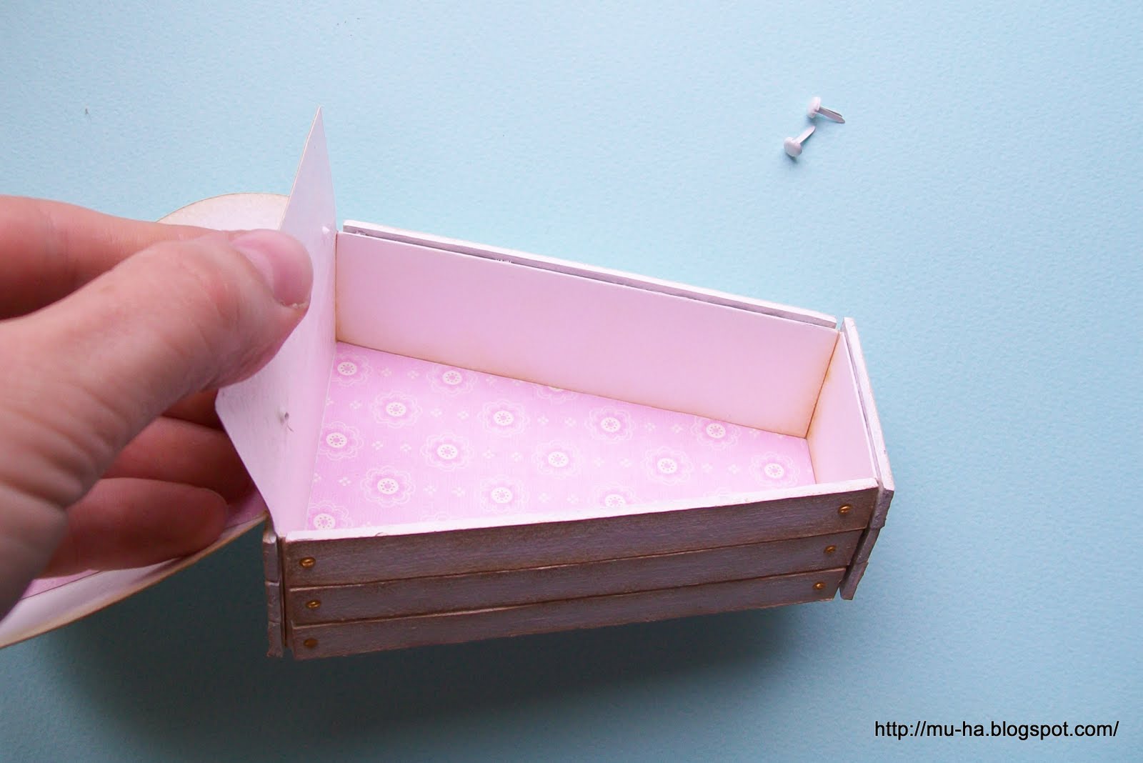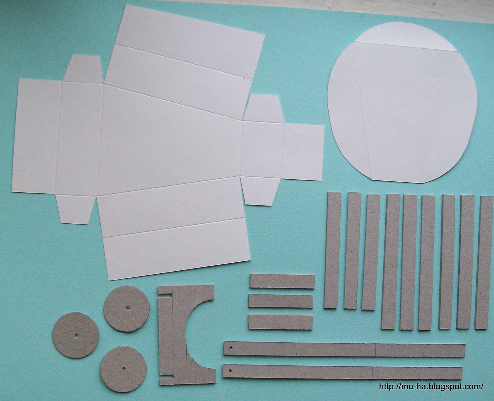 6.На дно тележки и на деталь крышки приклеиваем детали из скрап бумаги соответствующего размера.