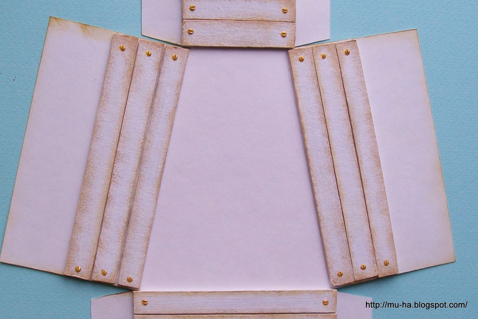 5.Теперь если у вас есть брадс в форме гвоздиков приколачиваем наши досочки с помощью брадс, если нет, то ставим крупные точки контуром и даем им немного подсохнуть, затем лезвием ножа имитируем шляпки гвоздей