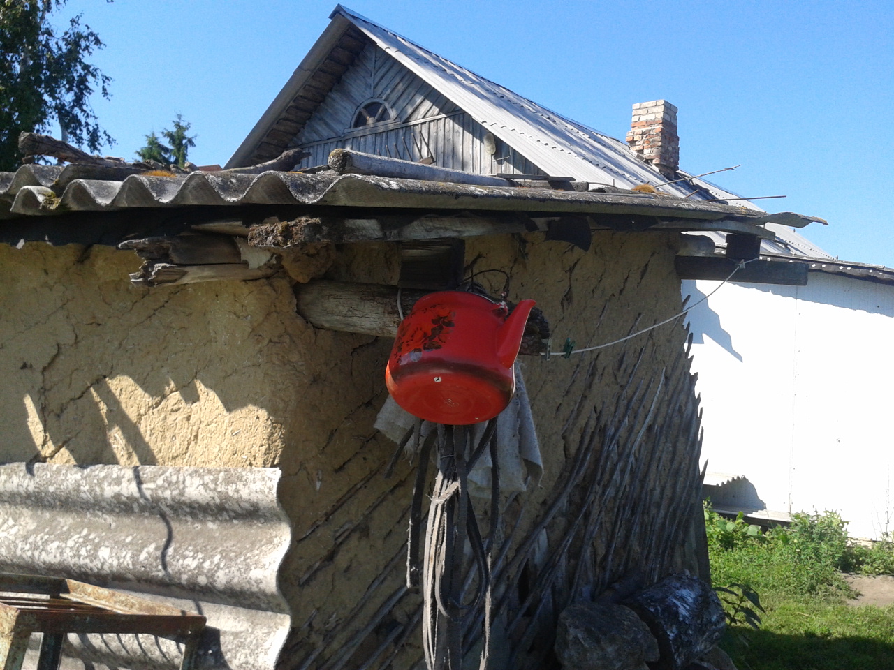 Ну а этот сюжетец где-то в подсознании не давал мне покоя всю весну и сидел занозой: что не так??? Ну висит под крышей старого сарая ЧУЖОЙ видавший виды чайник… Ты-то при чём? А потом осенило: его ж надо преобразить!!!! И стащила я его (каюсь!!!) потихоньку, привезла домой, спрятала на балконе (ага, муж же опять бухтеть будет про барахло, и дом запущен, и внимания ему не уделяют… У вас не так?) Как тока курсы заканчиваются, я его к рукам-то и приберу…В смысле, руки к нему приложу… И верну хозяйке…Представляю эту картину маслом ))) Кстати, пропажу она, по-моему, ещё не обнаружила ))) Да ей и некогда: внучка в самом городе Париже на конкурсе балетном первый приз взяла… Знай наших!!!