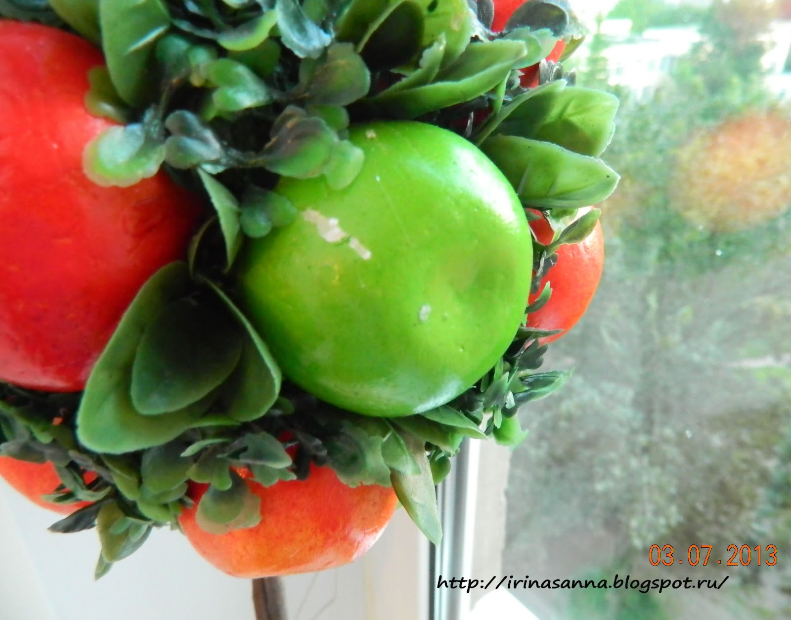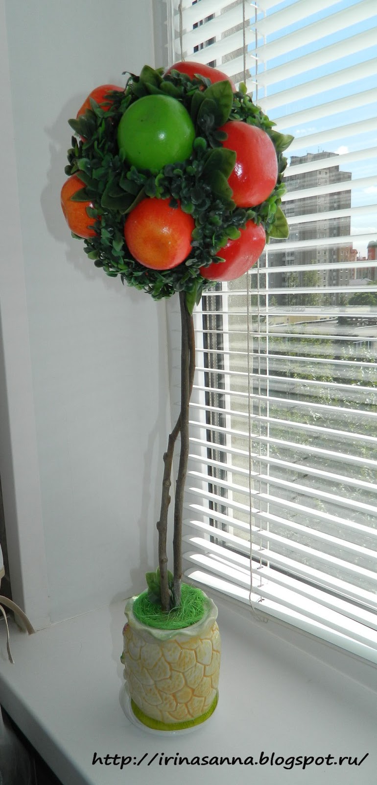 Между делом пробую новые техники. Из очередного набега на всем известный магазин принесла много всякой всячины, получился вот такой топик. Основа – пенопластовый шарик, фрукты и травку клеила горячим силиконом, основа – веточки, залито гипсом.
