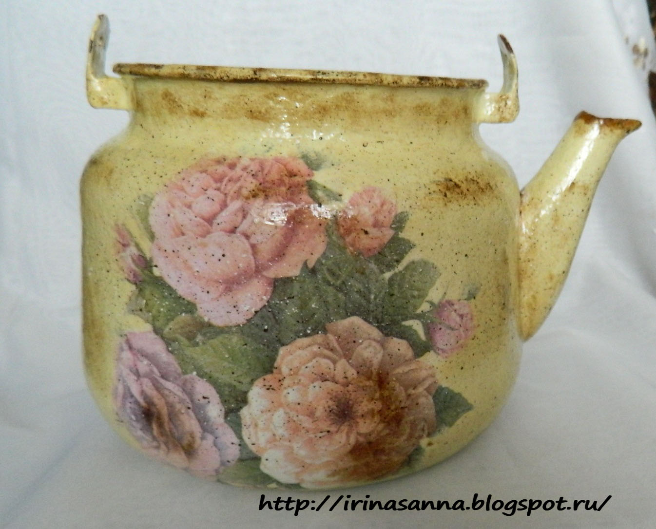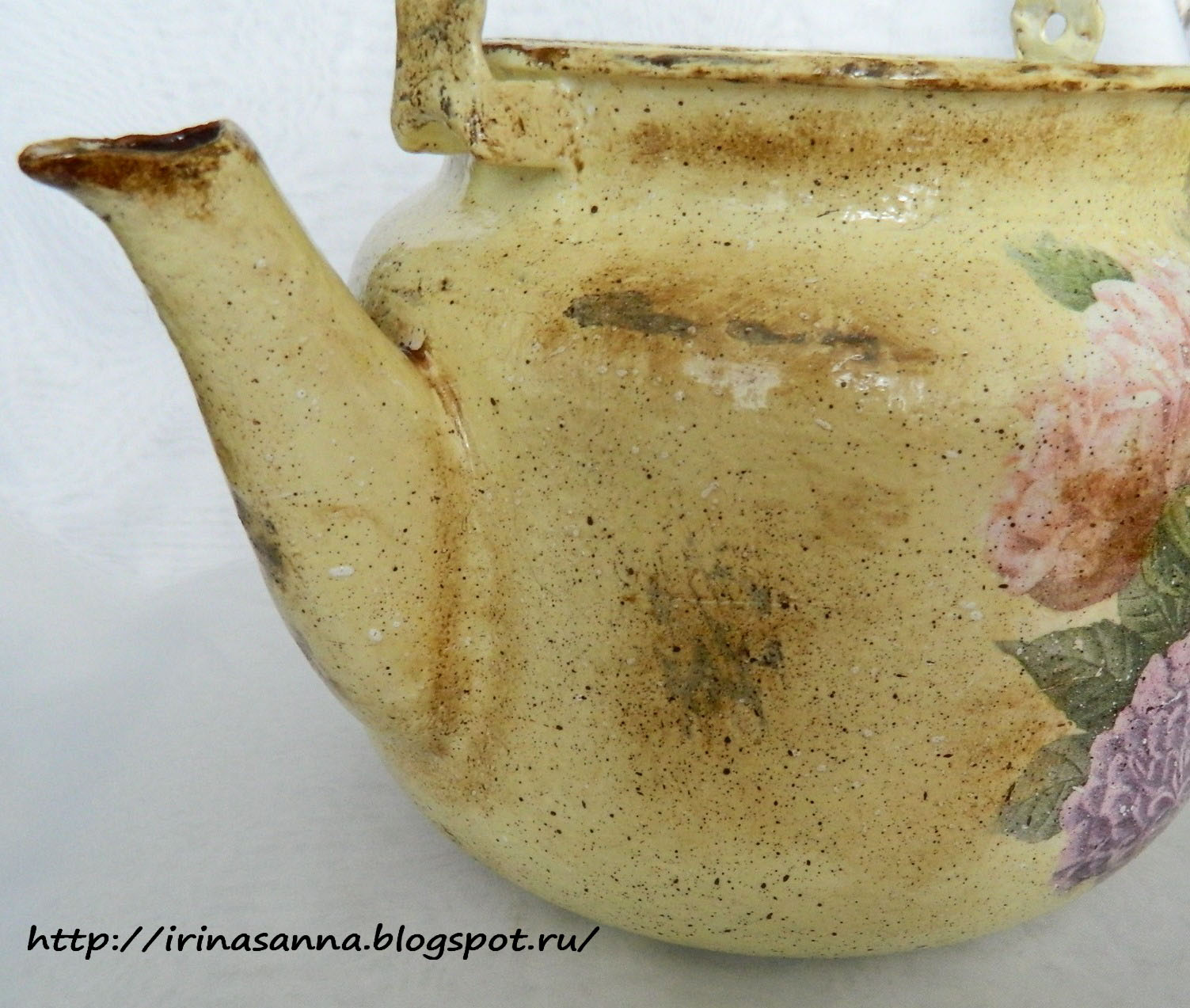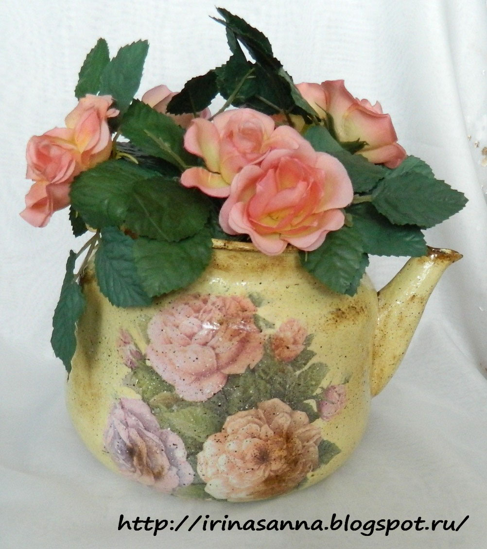Вот такой до переделки))) Тщательно отчищенный золотыми ручками тётушки ))) А как же, даже под крышей старого сарая вещи должны висеть чистыми ))) Даже пригоревшее когда-то дно без единого намека на копоть ))) Вооружилась я наждачкой...ага, наивная ))) Чайник-то советский ещё, не китайский ширпотреб... стерла все руки, а эмаль только чуть-чуть поцарапалась.. Вот это качество!!!!