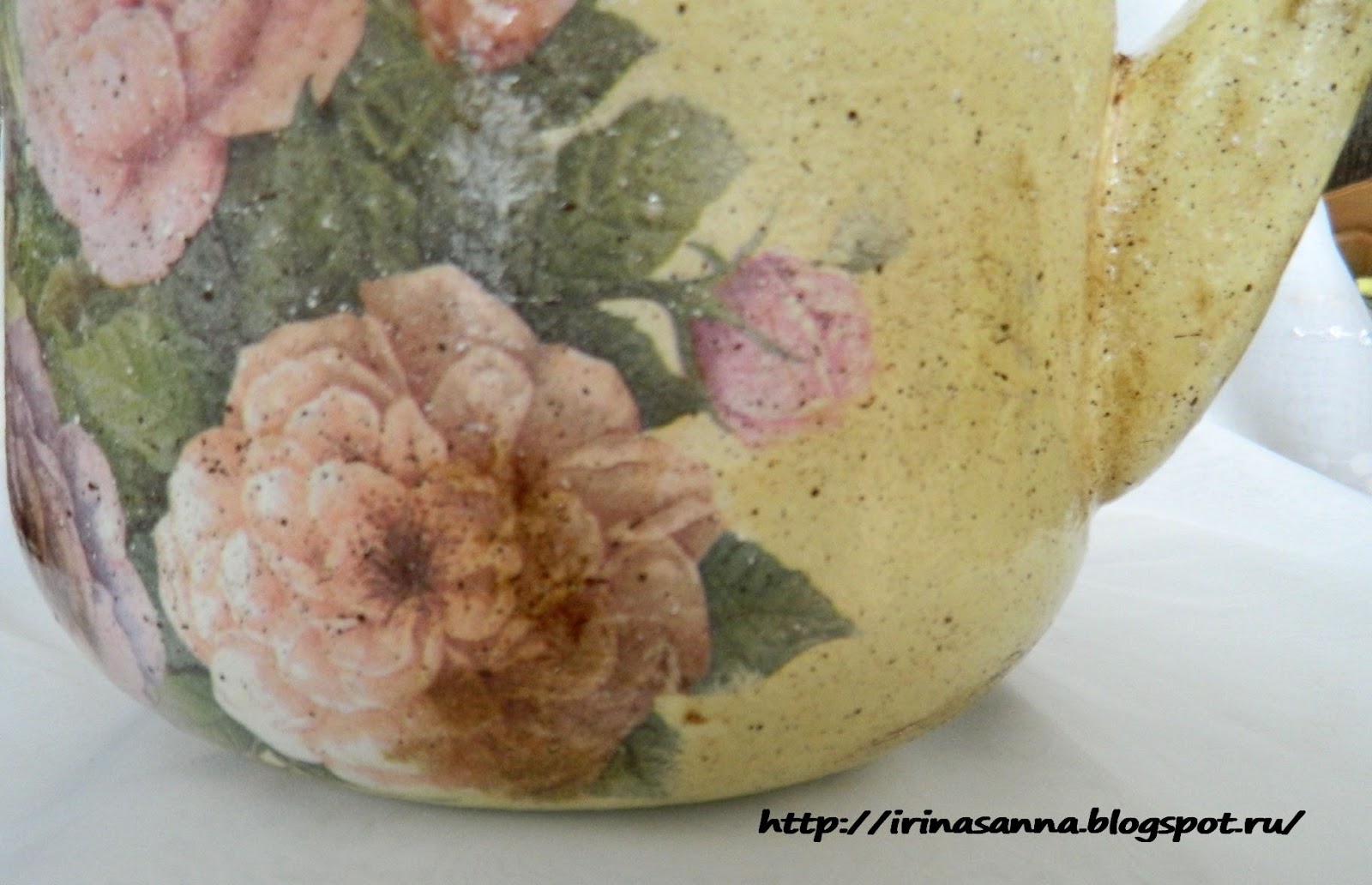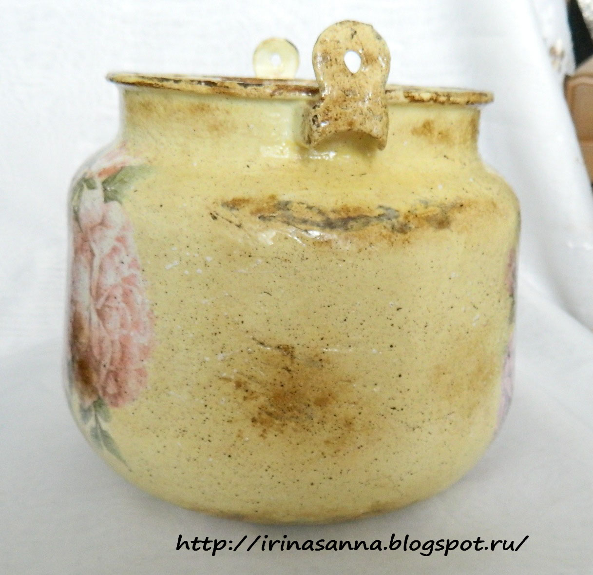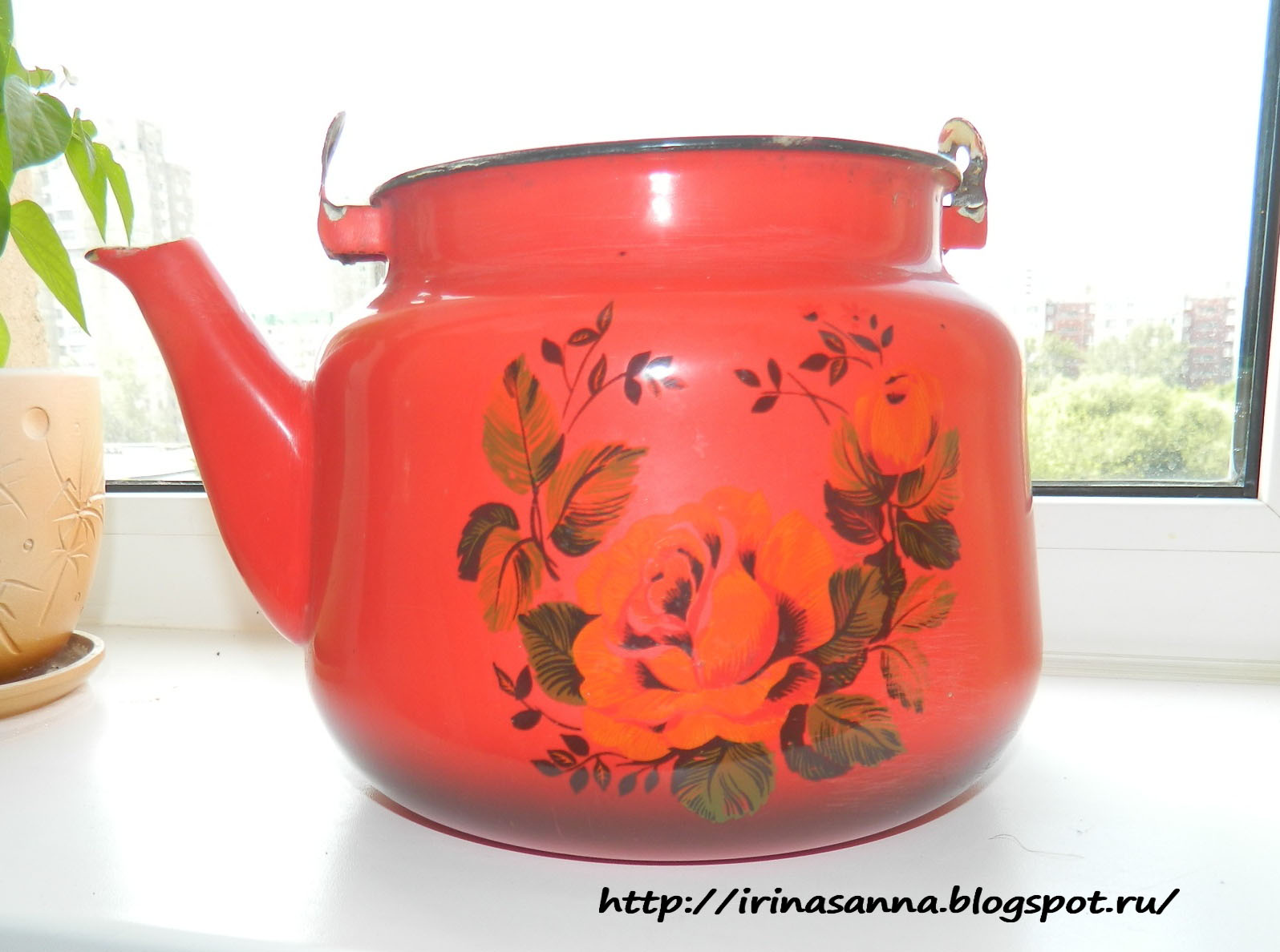 Вот такой до переделки))) Тщательно отчищенный золотыми ручками тётушки ))) А как же, даже под крышей старого сарая вещи должны висеть чистыми ))) Даже пригоревшее когда-то дно без единого намека на копоть ))) Вооружилась я наждачкой...ага, наивная ))) Чайник-то советский ещё, не китайский ширпотреб... стерла все руки, а эмаль только чуть-чуть поцарапалась.. Вот это качество!!!!
