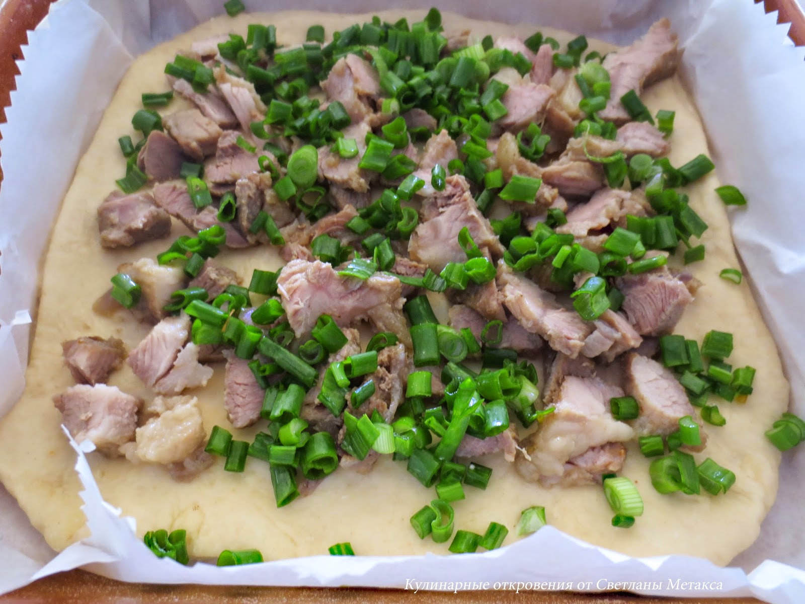 Готовое мясо порезать на более маленькие кусочки и равномерным слоем выложить на тесто.