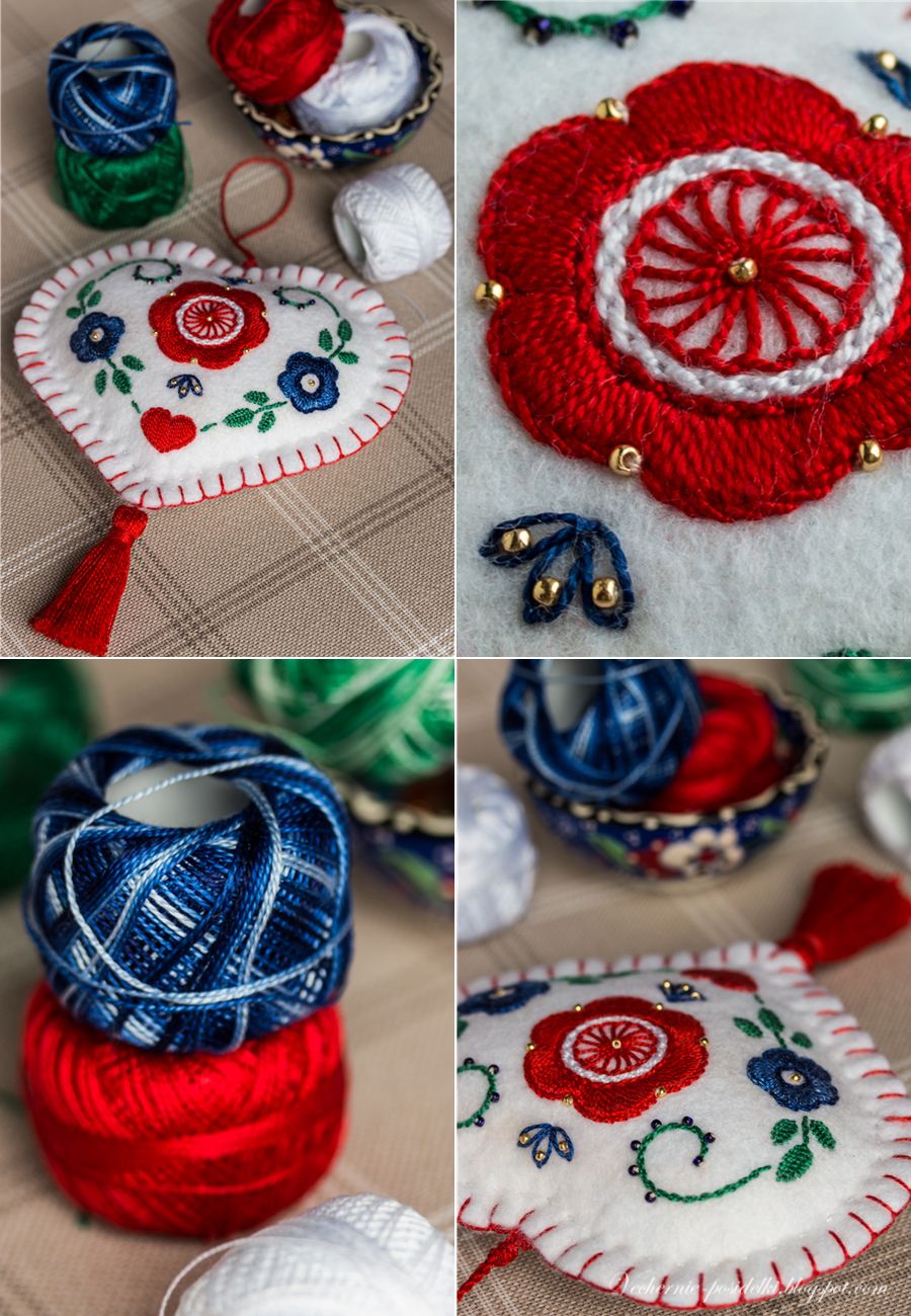 Это сердечко — продолжение прошлогодней фетрово-сердечной серии (как раз можно сравнить как смотрится на фетре обычное мулине и жемчужное). Размер и форма та же, как и фольклорный колорит. Только те были родом из шале, а это, мне кажется, получилось какое-то скандинавское. На ёлке, думаю, будет смотреться здорово.