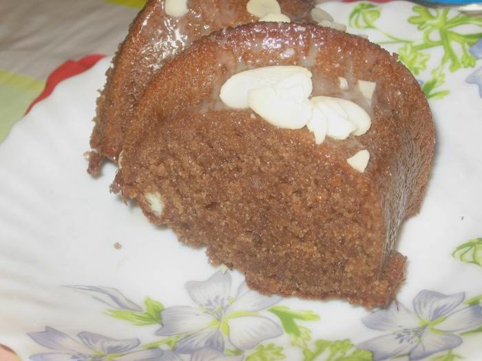 Готовый манник я смазала сгущёнкой и посыпала миндальными хлопьями.