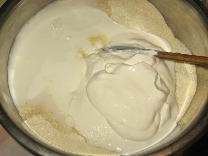 Сначала смешать все сыпучие продукты сахар, манную крупу, разрыхлитель.