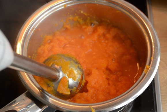 После того, как тыквенная масса немного остынет, разомните мякоть в однородную массу ступкой или блендером.
